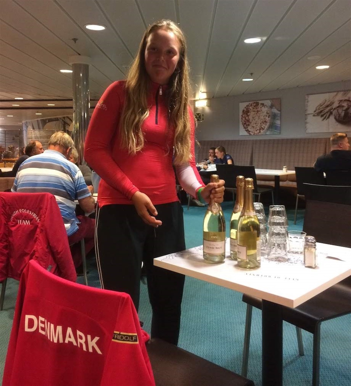 Hestene pakkes i 'seng', og rytterne går i buffeten. Denne gang masser af mad. Ponyrytter Astrid Skovgaard havde vundet guld for pony og gav derfor champagne på færgen.