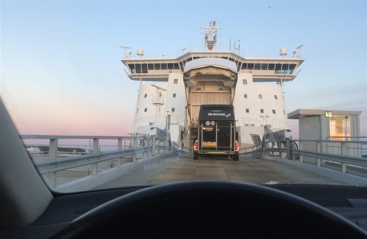 Færgen er i land om en time. Der er morgenmad på færgen og den er rigtig fin. Ankomst kl. 7.15. Hvor er det skønt at se sin hest efter alle de timer med uvished om, hvordan de tager det. Der gives mad og nyt rent vand og gøres klar til afgang.