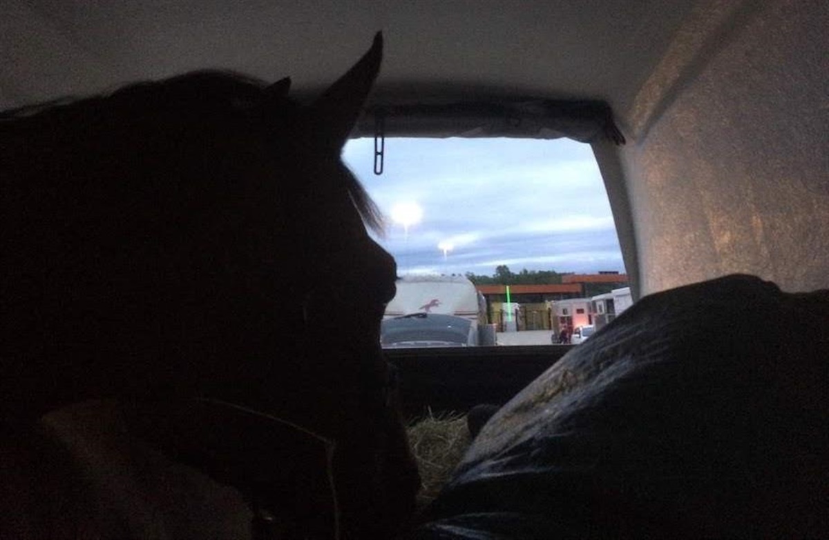 kontakt over Messenger mellem rytterne, og der gøres fællesstop undervejs, hvor hestene kommer ud at få strakt benene og tilbudt vand. Dette gjorde jeg hver 4. time. Princess tog det så pænt, og hun blev forelsket i Lasse (Niels Goldschmidts hest) under pitstoppene undervejs. Det var meget hård for mig at køre selv, så tidligt om morgenen. Det var ikke sjovt.