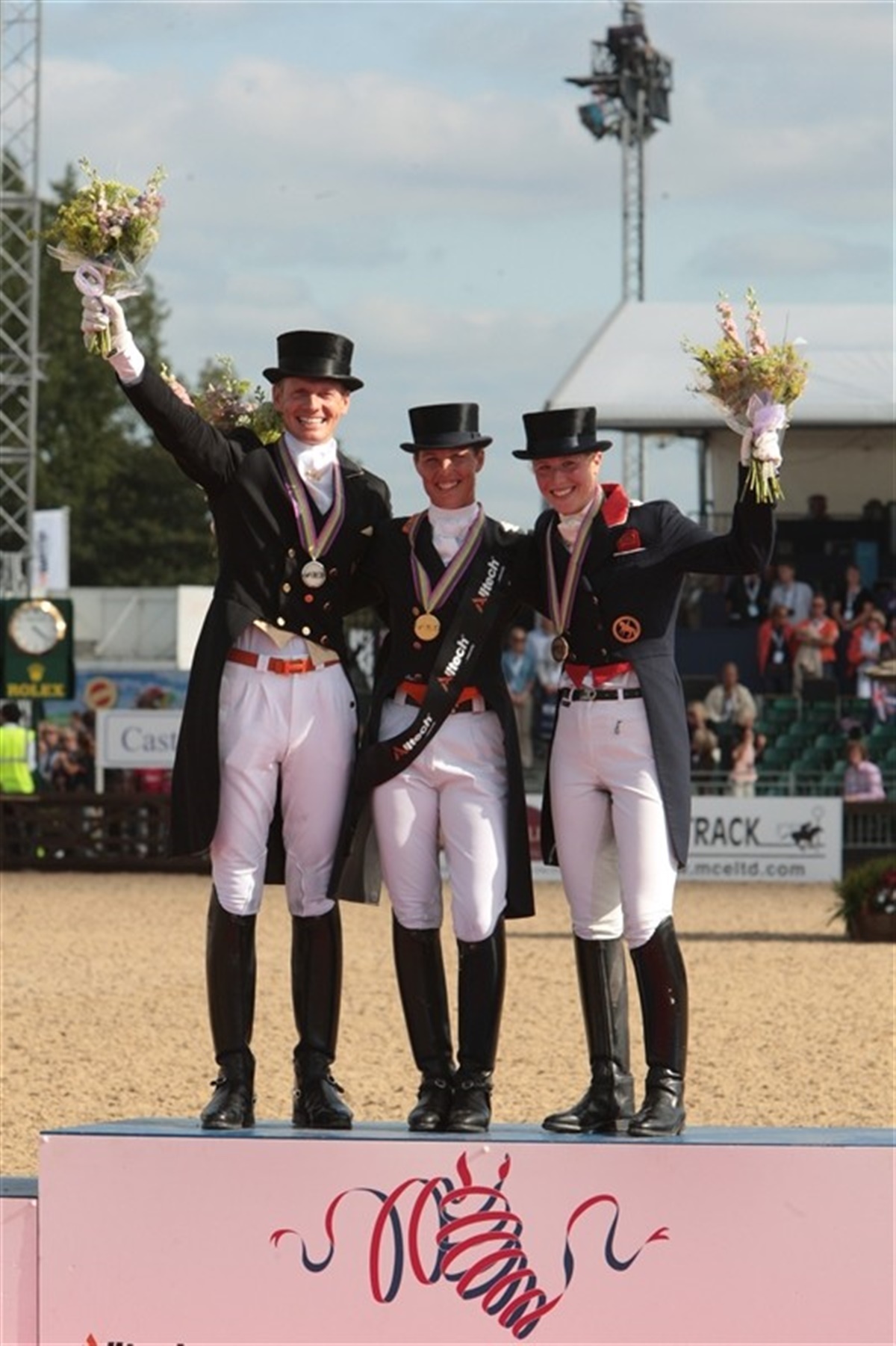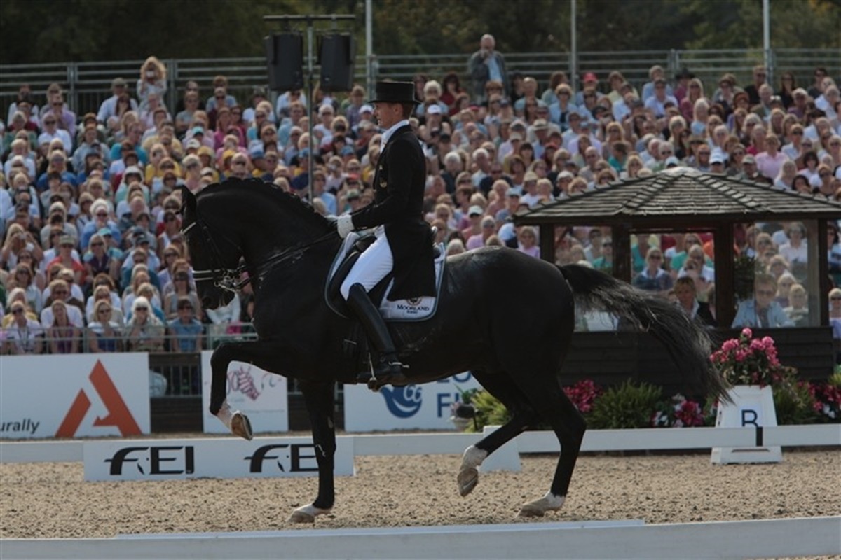 Bedst som vi efter Grand Prix'en troede, at nu havde vi set dressursporten på sit absolutte topniveau, så flyttede rytterne i dag grænsen endnu længere ud. Rytterne red med et mod og en vilje til at satse, som gav os helt eventyrlig sport, og så dansede tre heste gennem Specialen med en energi og et udtryk, som vi ikke har set tidligere. Det lå i kortene, at 9-årige Moorlands Totilas og Edward Gal skulle vinde den individuelle guldmedalje - men på trods af at hingsten i dag fik 32 ti-taller, så var der også flere 2, 3 og 4-taller mellem karaktererne, og i dag virkede den unge hingst mere spændt og stresset. Alligevel viste han en passage, som dommenre gerne ville dømme udenfor skalæn, fortalte de, og en piaffe og øgninger der matchede, men der blev fejl i etterserien, i et changement og så blev hingsten også noget spændt i skridten. Aligevel fik de drømmescoren 83,042% og dermed distancerede de sig fra Anky van Grunsven og Salinero, der førte på daværende tidspunkt med 77,958% I går var engelske Laura Bechtolsheimer og den danske varmblodsvallak Mistral Højris nr. tre i den individuelle konkurrence. Presset var enormt på Laura, da hun red ind med Mistral på hjemmebanen. - Jeg ved at min hest altid giver alt i sig og til mig, fortalte hun, han er så talentfuld. Det fik både dommerne og tilskuerne at se, for Mistral leverede et helt fejlfrit program, hvor han stod flot fortil og viste helt klassisk passage og piaffe lige efter lærebogen. Pointene begyndte at samle sig på Lauras konto, og da hun hilste af lød der et brøl fra publikum, sensationen var tydelig for enhver, den unge engelske rytter havde slået Anky van Grunsven og var sikker på mindst bronze med 80,083% Så red Adelinde Cornelissen på banen med Parzival. Stilheden sænkede sig langsomt over stadion, og så red hun op ad midterlinjen og gav os alle en helt uforglemmelig oplevelse. Parzival gik herligt spændstig og elektrisk men samtidig rummeligt og elegant - det var en nydelse. Karaktererne nåede op på samme højde som Edwards Gals, de blev højere, mindre, hele tiden kunne vi følge udviklingen, det var dressur når det er aller bedst og mest spændende. Den mindste usikkerhed, den mindste fejl og guldmedaljen ville gå til Edward Gal. Da Adelinde hilste af jublede hun, og det gjorde hun hele vejen ud. Da hun kom ud ønskede hun Edward tillykke - nå ja var hans svar, du slog da mig. - Jeg havde set på de forkerte karakterer på resultattavlen, forklarede Adelinde med en smittende latter, så jeg trode jeg var blevet nr. to, det var først da Edward fortalte jeg havde slået ham, at jeg blev klar over, at jeg havde vundet guld. Adelinde og Parzival fik lige præcist et procentpoints mere end Gal.