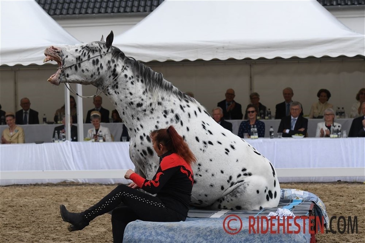 Rosi Hocheggers danske knabstrupper Scout havde lidt sin egen holdning til, hvad han skulle (eller nærmere ikke skulle) i dagens show, men det bragte blot latteren frem, og især børnene jublede over den frække, plettede hingst.
