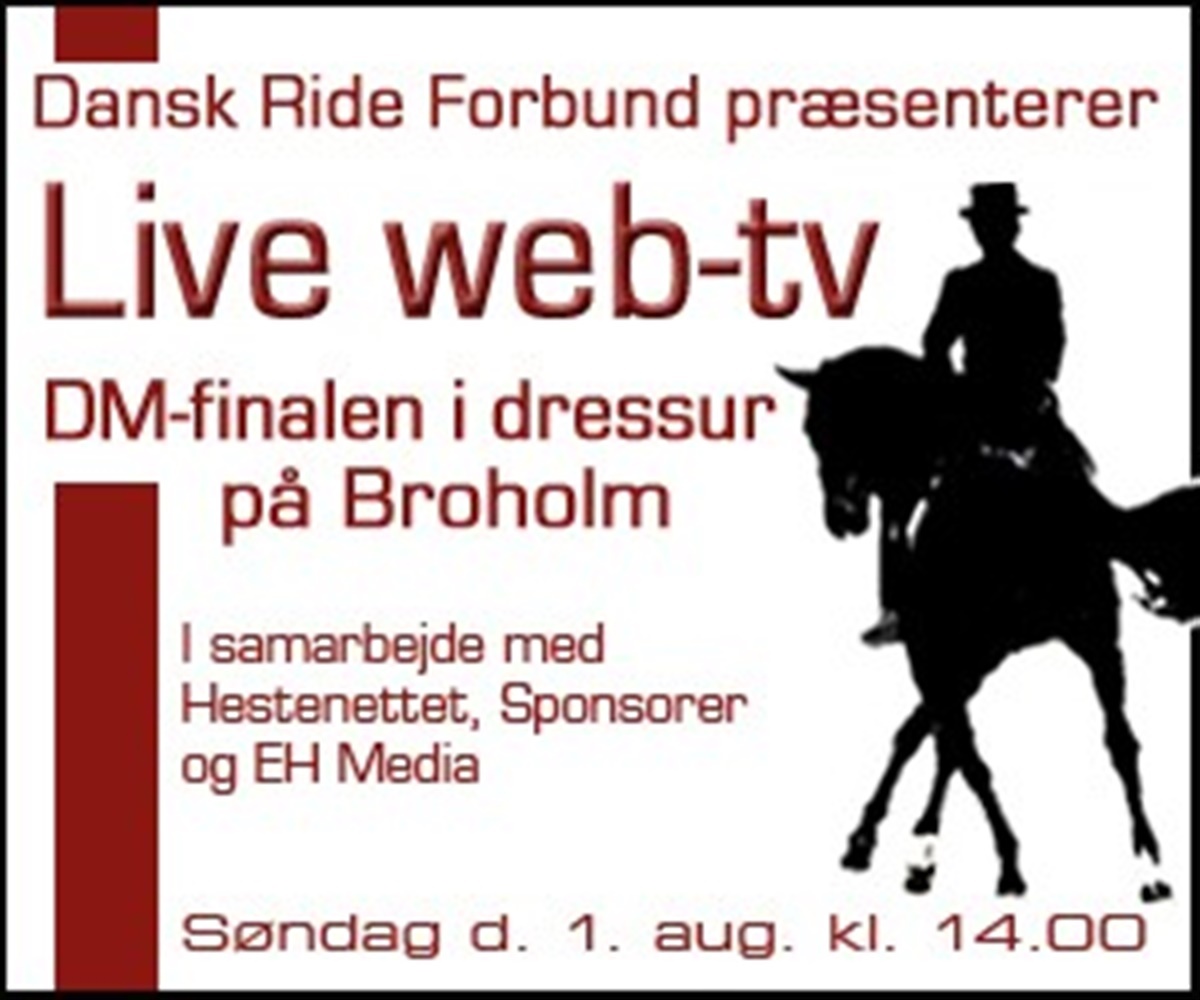 Direkte resultater på web-tv fra DM i dressur Dansk Ride Forbund sender i samarbejde med Hestenettet, Sponsorer og EH Media direkte web-tv fra DM-finalen søndag den 1. august. Det forventes, at stillingen og resultaterne kan følges direkte fra DRF Live sammen med den direkte tv-sending, og det er Dressurens Venner, der sørger for direkte kommenterer fra finalen. Link til den direkte sending kan findes via banner på Dansk Ride Forbunds hjemmeside. Danmarks bedste dressurryttere klar til mesterskabsdyst på Broholm DM i dressur for seniorer afvikles den 30. juli – 1. august på de udendørs dressurbaner i de smukke omgivelser på Broholm, hvor det ikke kun er DM-titlen, der er på spil. Landstræner Rudolf Zeilinger bruger nemlig DM som udtagelsesstævne til VM i USA til efteråret. Dansk Ride Forbunds protektor HKH Prinsesse Benedikte overrækker præmier i mesterskaberne. Ny danmarksmester i dressur Der er lagt op til hård konkurrence om DM-titlen i 2010, hvor en ny danmarksmester skal kåres. Den forsvarende mester Nathalie zu Sayn-Wittgenstein stiller nemlig ikke op, da hun skal føde i juli. Hermed er kampen om mesterskabet åben for de øvrige af landets bedste dressurryttere, som udover mesterskabskampen også skal benytte stævnet til at gøre sig gældende til VM-truppen. Blandt de 27 mesterskabskandidater kan nævnes Andreas Helgstrand, Anne van Olst, Sune Hansen, Lone Bang Hansen, Sidsel M. Johansen, Joachim Thomsen, Sanne Henningsen og Jeanette Sund. Handicapmesterskaber for anden gang på Broholm De bedste danske handicapryttere mødes for 2. år i træk på dressurbanerne på Broholm for at dyste i forbundsmesterskaberne i handicapridning. De danske handicapryttere er enormt stærkt ridende, hvilket senest indbragte Danmark flere mesterskabstitler ved de nordiske mesterskaber 2010. Handicapridning inddeles i fire forskellige grader, der afhænger af rytterens handicap. Broholm i nye klæder Rideanlægget på Broholm har været gennem en omfattende ombygning, der betyder, at rammerne for DM i dressur for seniorer og forbundsmesterskaberne i handicapridning i 2010 er i særklasse. Bl.a. er der blevet anlagt en ny ridebane med fiberbund fra Allan Neergaard, og der er bygget en ekstra tribune, hvilket giver endnu flere publikummer muligheden for at opleve den smukke ridning fra de næsten 500 tilmeldte ekvipager. Resultaterne kan følges direkte på nettet på DRF Live, og Mølgaard Data sørger for, at også delkaraktererne kan følges online. DRF Pressemeddelelse