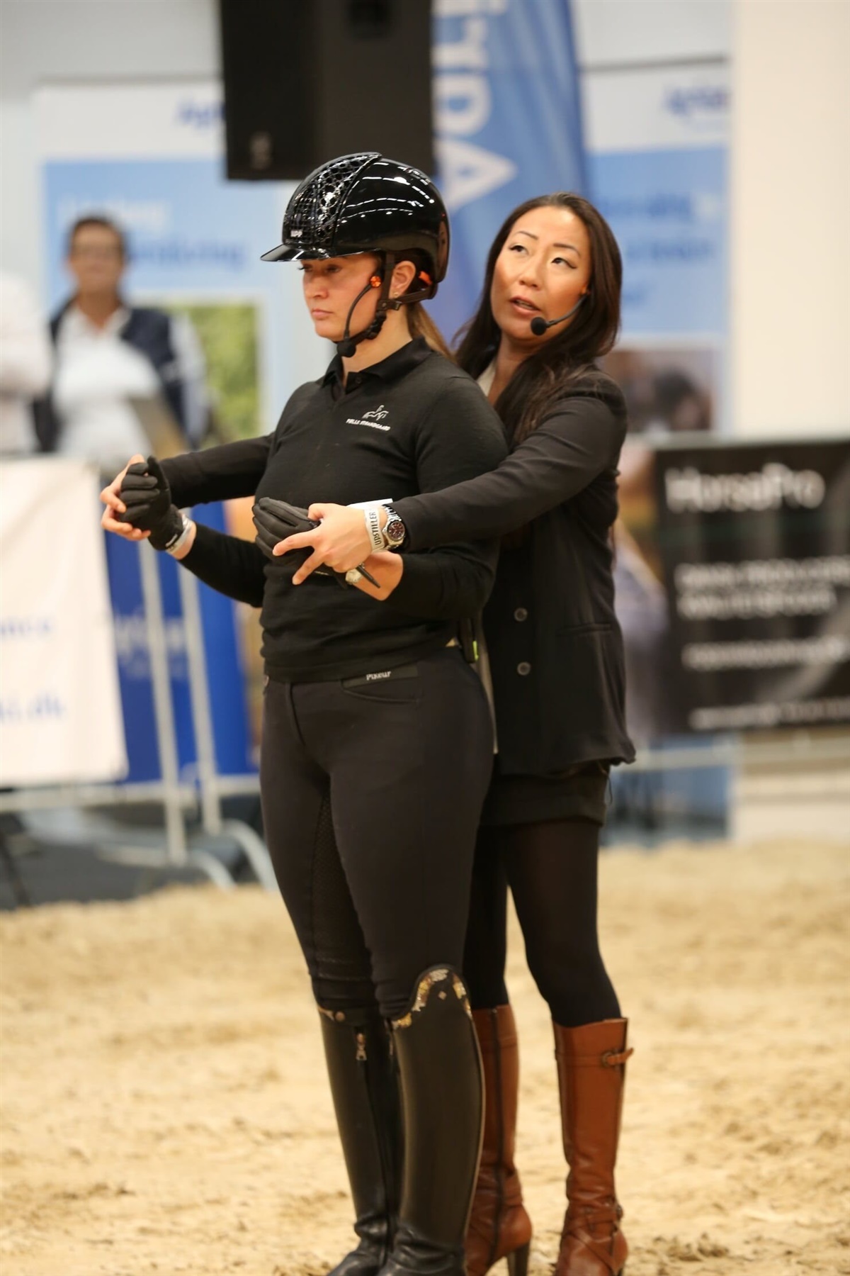 Det bragte også stor latter, da Ditte Young bad rytterne om at lægge sig ned på alle fire, så hun kunne vise dem præcis hvad hesten mærkede i sin egen krop.