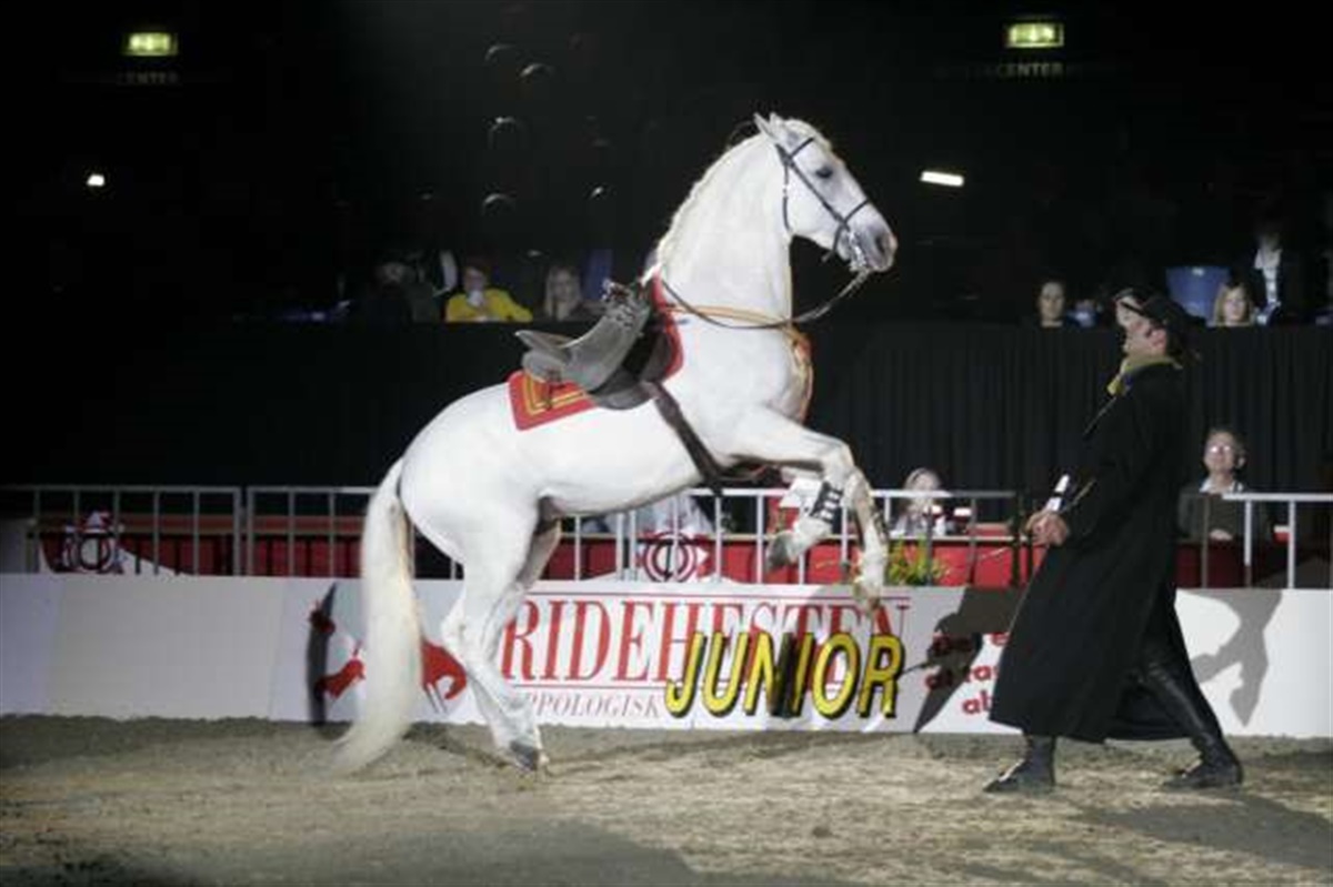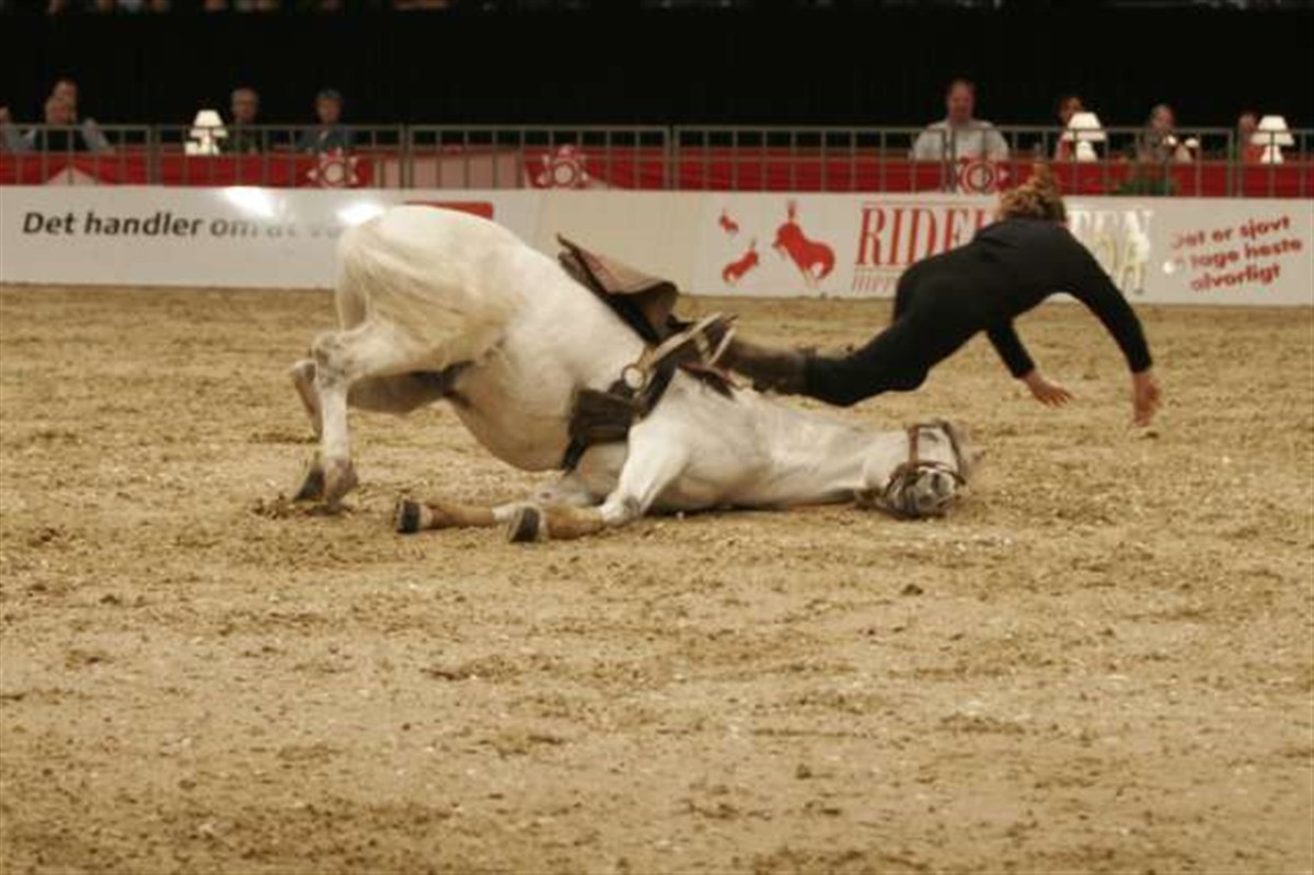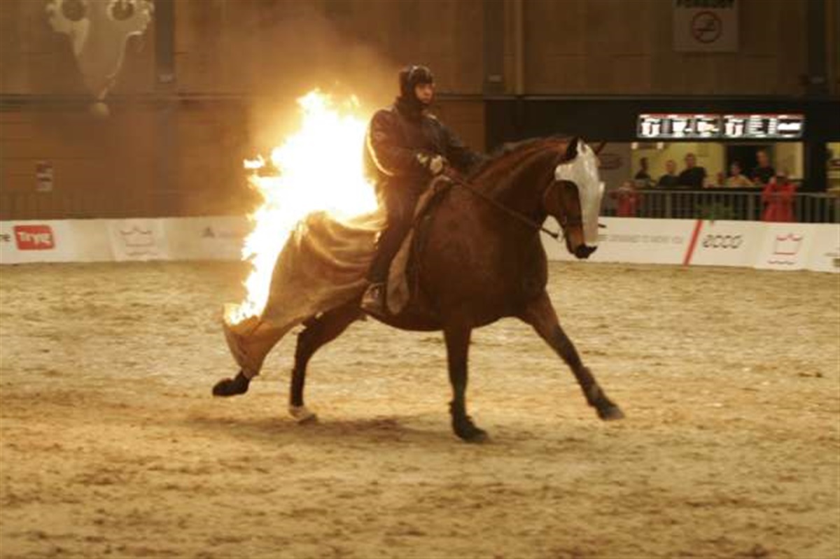 Farlige stunts og morsomme tricks afløste hinanden i det to timer lange show udført af ”The Devils Horsemen”. Skurkene røg af heste, blev slæbt efter hestene eller styrtede til jorden sammen med hesten. De halsbrækkende stunts er absolut ikke et resultat af tilfældigheder, men af lang tids minutiøs planlægning og træning, kunne Daniel Naprous berolige publikum med. Gruppen har leveret heste til en bred vifte af film produktioner: Braveheart, Zorro, Black Beauty, James Bond, King Arthur, Robin Hood, The Da Vinci Code for at nævne nogle få. Deres stuntheste optræder jævnligt med kendte navne som: Mel Gibson, Pierce Brosnan, Glenn Close, Sean Connery og Antonio Banderas og mange andre. Se de mange fotos på denne hjemmeside, og læs mere i Ridehestens aprilnummer.