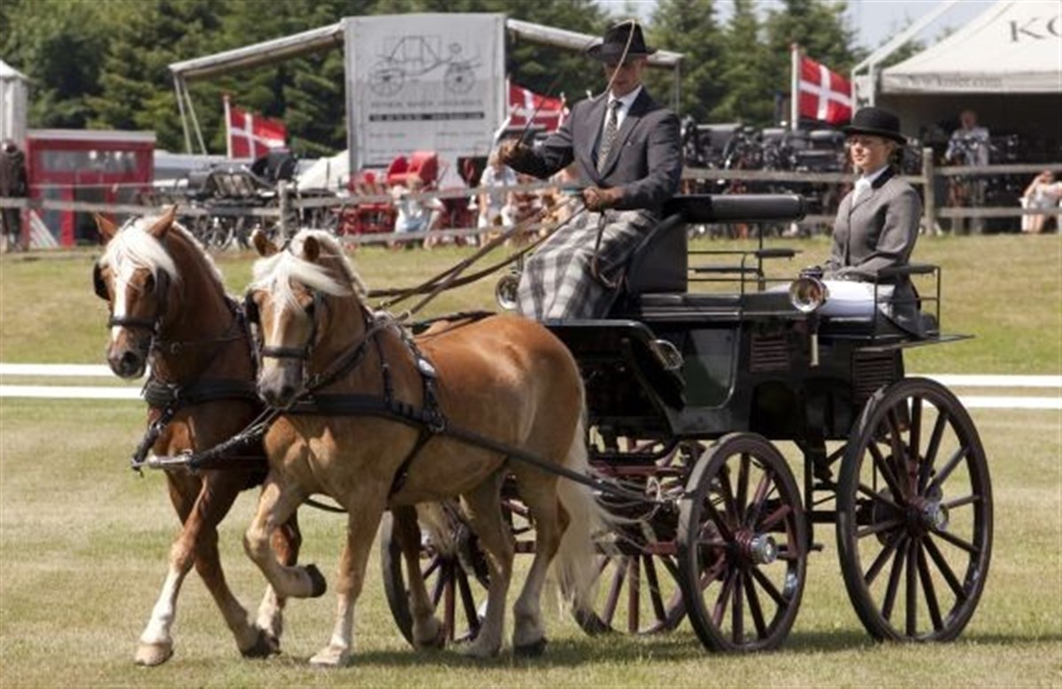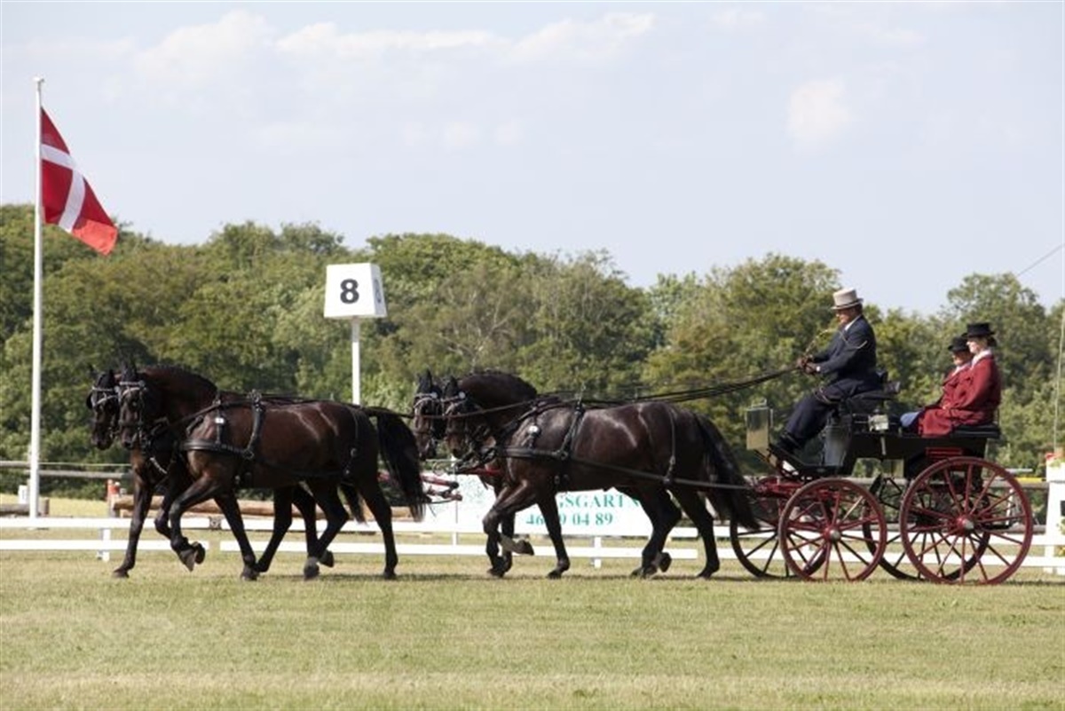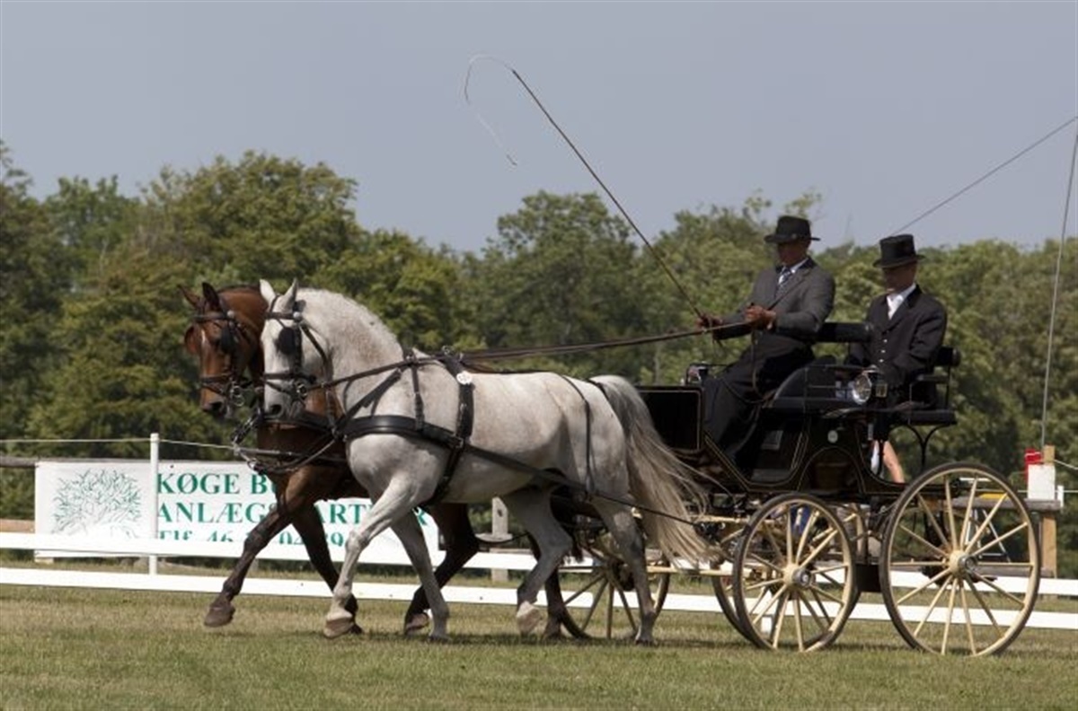 2-spand pony Igen fredag var det favoritterne, der vandt dressur. Lars Dau satte sig på førstepladsen med 46,08 strafpoint i 2-spand pony klassen. Nr. 2 blev Henrik Sloth med 50,88 sp. og nr. 3 blev Bjarne Wisler med 57,28 sp. Lars Daus førsteplads blev ikke helt så overbevisende, som man kunne havde troet, og det er der en grund til. På vej til præsentation trådte den ene pony på en sten og blev halt. Der var kun et at gøre, og det var at køre ned til stalden og tage reserveponyen. Heldigvis er man en stor flok fra Revsø Rideskole, som kunne hjælpe, og på under 10 minutter var reserveponyen flettet, lagt sele på og havde fået monteret dupper på skoene, så den kunne stå fast på græsset. Desværre kunne det også ses på dressuren, at der var skiftet pony. Den stabilitet, som ellers kendetegner Lars Dau’s ekvipage var ikke helt så stabil, som den plejer, men dog nok til at kunne score førstepladsen i klassen, og helt velfortjent. Henrik Sloths ponyer, der blev nr. 2, har noget mere udstråling, men til gengæld er stabilitet fortil et problem – ellers var det rigtigt pænt kørt. Bjarne Wisler kom helt velfortjent på 3. pladsen med sine to fjordheste. Bjarne er i den grad en hestemand, der kan få det bedste ud af sine fjordheste. 2-spand heste Finn Qvist vandt klassen for 2-spand hest med 45,95 strafpoint efterfulgt af Kurt Klindt med 50,82 sp. Nr. 3. blev Peter Chr. Jespersen ligeledes fra Revsø. Hans Henrik Nielsen blev nr. 5 med 59,14 sp. Når vi lige tager ham op, er det fordi han normalt kører en kanon maraton, der gør, at han rykker rigtigt mange pladser frem. Og selv om han ligger knap 15 point efter Finn Qvist, er det bestemt ikke usandsynlig, at han kører sig frem til podieplads i lørdag på maratonen. 4-spand Klassen 4-spand blev vundet af Ole Buch Jensen, ganske som forventet med 53,38 sp. Nr. 2 blev den helt unge kusk, 19-årige Mathias Birkely Ottendal fra Fyn med 70,78 sp. Nr. 3 Henrik Jensen med 73,98 sp. Juniorer Fremtidens kuske – juniorerne har 8 kuske til start, og klassen blev vundet af Sofie Amalie Kongsted med 54,96 sp. På en delt 2. plads kom Mads Kristiansen og Camilla Thor Christensen med 61,63. Nr. 4. blev Pernille Rasmussen med 67,76 sp. Spændende lærdag Der i den grad lagt op til en spændende dag lørdag på maratonen. Der skal køres til især i forhindringerne, og alle porte skal køres korrekt i første omgang. Rettelse af fejl koster 20 strafpoint, og det har ingen plads til efter dressuren fredag, ikke engang en Ole Buch Jensen. Godt nok kan han bruge lidt mere tid i forhindringerne end sine konkurrenter, men ikke for meget tid, så der er helt sikkert gået forhindringer det meste af nattet. Forhindringerne skal ikke bare sidde på rygraden, men helt ud i fingerspiserne, så kuskene kan lede heste og ponyer den rigtige vej gennem forhindringerne. Der er otte forhindringer med porte fra A til E. Maratonen begynder kl. 9, og de første er i forhindringerne ved 10-tiden. Desværre er en enkelt ekvipage udgået. Amanda Justesens pony har fået et slem angreb af muk og er behandlet med bl.a. smertestillende medicin. Derfor kan den ikke starte i dag.