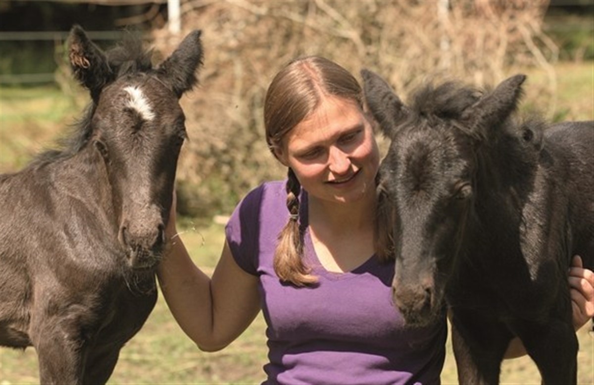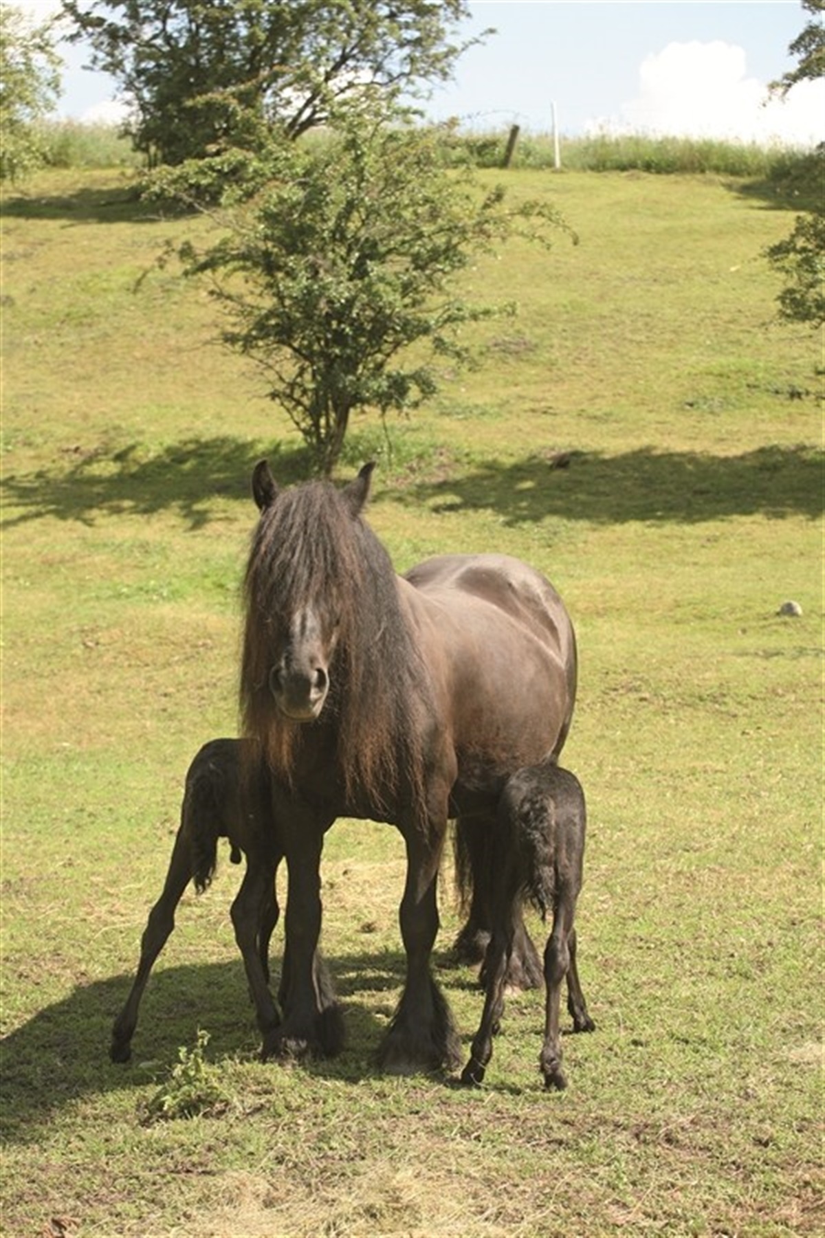 Regnestykket gik ikke op Dorthe Larsen, der avler fellponyer, opdagede 4. juni, at hendes ene hoppe, Lowlands Erin, uventet havde født tvillinger. – Godt nok syntes jeg på et tidspunkt i vinter, at Erin var blevet lidt rigeligt stor, men det kunne jo skyldes mange ting, og jeg anede virkelig ikke, at hun var med tvillinger. Så det var noget af en overraskelse at få, fortæller Dorthe – Jeg stopper helt op og skal lige stå et stykke tid, før det virkelig går op for mig, og jeg ender med at stå og sige højt til hoppen “du har jo fået tvillinger!”. Det var en meget underlig oplevelse, men begge føl så heldigvis godt ud og var hurtigt oppe at die, fortæller hun. To sunde føl Det viser sig, at Erin har fået både et hoppe- og et hingsteføl, og at de begge ser store og velfungerende ud. – Hoppen havde klaret det hele selv, men efterbyrden var ikke kommet, så dyrlægen kom kort efter og hjalp hende af med den. Han var meget imponeret over at se begge føl i så god stand og spår dem begge en god fremtid, fortæller Dorthe. Dyrlægen havde et par uger forinden tilset hoppen, da hun var meget besværet med vand i benene. Højst sandsynligt har hoppens system været på overarbejde pga. de to føl. Glæder sig Dorthe glæder sig over, hvordan de to tvillingeføl allerede har haft stor glæde af hinanden på folden. – Det er sjovt at se, hvordan tvillingerne helt fra start ganske naturligt har været tæt på hinanden og fået lov til at lege sammen af deres mor. De har været helt anderledes sociale sammen end føl fra to forskellige mødre, oplyser Dorthe, der glæder sig til at følge udviklingen og se dem vokse op. – Umiddelbart kan jeg ikke drømme om at skille mig af med nogen af dem, slutter hun.
