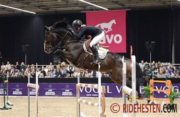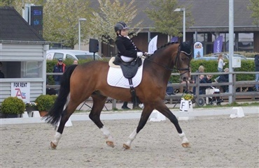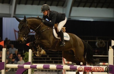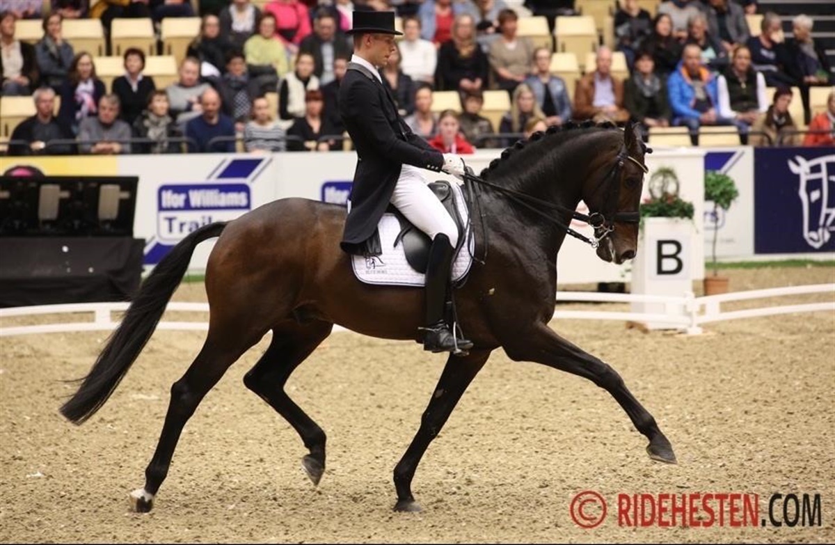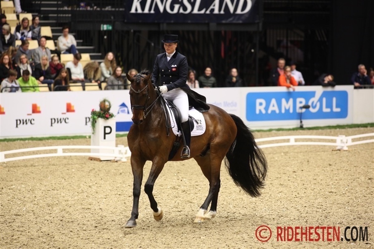 Det er naturligvis førsteberideren på Blue Hors Daniel Bachmann Andersen der er tale om. Sejren i dag blev efter et nydeligt og fejlfrit ridt honoreret med overlegne 74,579 % mens Blue Hors Don Olymbrio opnåede 70,789 %. På tredjepladsen fulgte Lone Bang Larsen på sit nye Grand Prix-håb, Darwin Toftagergaard e. Blue Hors Romanov/Aquilino, med 70,368 %, og først derefter placerede to norske ryttere sig. I alt var der 14 ryttere i klassen.