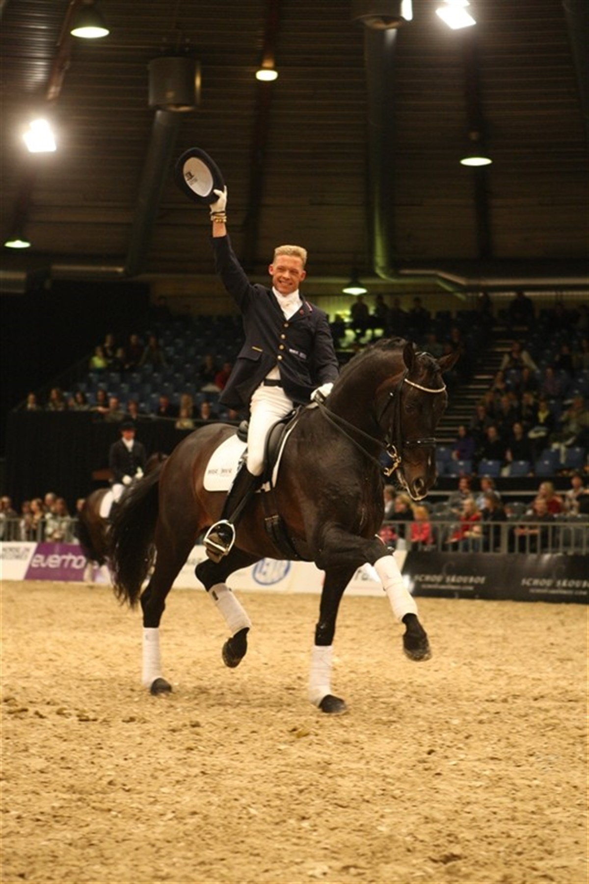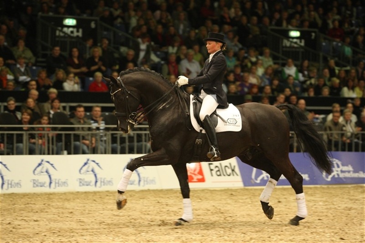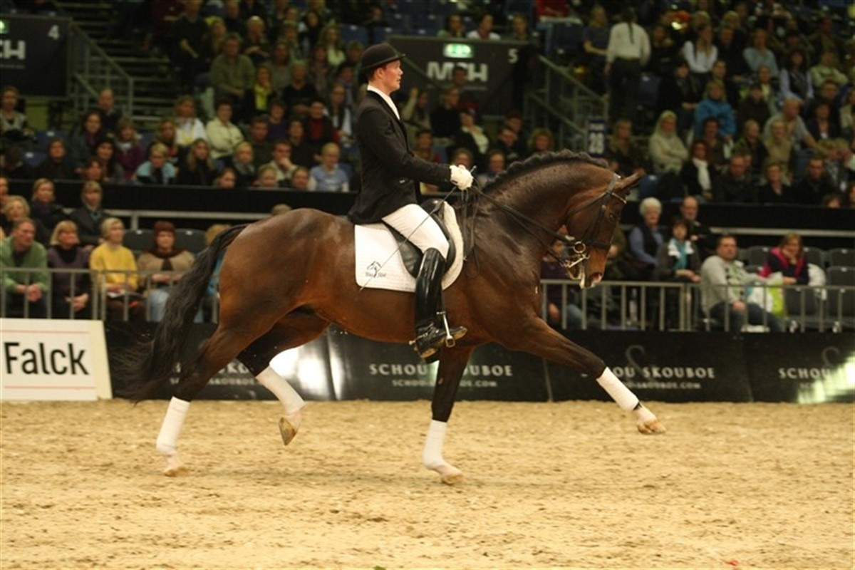 - Vi vil gerne se heste, der går villigt fremad, med dejlig forlængelse af skridtlængden i øgningerne, og mulighed for at sætte sig bagtil i afkortningerne, fortalte dommerne Kurt Christensen og Susanne Baarup bl.a. i dagens klasse for 6- og 7-års heste i MB-øvelser. I versade skal hestene træde ind under sig, og gå med en god rytme og bæring - rundet i hele kroppen, forklarede dommerne mens Sune Hansen og Anna Blomgren demonstrerede dette på bedste vis med hingstene Blue Hors Rush Hour og Bøgegårdens Laurino. Rush Hour viste en fantastisk galopkadance og gode changementer til begge sider, kommenterede dommerne. Mens Anna viste meget fine changementer på Laurino, der dog var lidt spændt inde i den runde hal B, der var fyldt til bristepunktet, forklarede dommerne. Steffen Fram/Damsey og Nathalie zu Sayn-Wittgenstein og Fabienne var næste hold på banen. Begge heste er 7 år gamle. Damsey fik ros for sine changementer, han virkede ret sikker, udtalte dommerne. - Nathalie er meget rutineret, og får lavet gode korrektioner, for Fabiene virkede lidt spændt i de urolige omgivelser, forklarede Susanne Baarup for publikum. Næste hold på banen var Onassis/Susanne Barnow samt Lotte Wiuff Straarup/Showtime. I traversaden kunne vi godt ønske lidt mere selvbæring og afskub hos Showtime, dommerne mente dog, at hingsten var noget mærket af omgivelserne, og lidt spændt for Lotte, og det kom desværre til at præge hele deres fremvisning, men det lykkedes for Lotte at få vist nogle gode momenter bl.a. flotte changementer. - Onassis, såfremt han går i denne form, med det dejlige sving, og den gode bæring, så kommer man rigtigt langt på dette her niveau, forklarede Susanne Baarup. Sidste hold på banen i klasse MB-øvelser for 6- og 7-års heste sponsoreret af Stald Ege var Uno Don Diego redet af Anna Blomgren og Sune Hansen på Blue Hors Hotline. Begejstringen kom omgående fra publikum, da speakerne oplyste, hvilke to ekvipager der var tilbage i klassen. De to tidligere fløjhingste fra deres kåringsårgang var en fornøjelse at følge på banen. - Der er flot sving og bæring i hestene, begge i en meget fin og fri holdning, udtalte dommerne. De er korrekt redet med en dejlig holdning og en god aktivitet op-ad-bakke. Begge laver et dejligt, solidt galoparbejde, op-ad-bakke i en god balance, begge lidt tøvende i changementer, men det er også unge heste, forklarede dommerne. I klassen for 8-års og ældre hingste kom Joachim Thomsen/Samarant, Michæl Søgaard/Rosentanz, Sune Hansen/Blue Hors Leredo, Michæl Grønne Christensen/Weltjunge samt Loudini/Sarah Thor Christensen til start. De 8-årige hingste Samarant og Rosentanz var på første hold, og de fik begge ros for deres travbevægelse og flotte holdning. - Sådan nogle frie traver kan man ikke blive træt af at se på, kommenterede dommerne, og så er det to rutinerede ryttere, der administrerer hestene flot, og så glæder vi os til at se dem på dressurbanerne også på et højere niveau. - Vi fornemmer nok, at her er et meget dressurkyndigt publikum, bemærkede dommerne, da publikum levede med i hingstenes øvelser - klappede begejstret over flyde traversader og imponerende frie traver og flotte changementer fra de ældre heste, men dommerne var også enige om, at en hingst især stjal billedet fra de øvrige: - Blue Hors Leredo har bare en bæring og en udstråling, der er helt i særklasse, han er født til dressur, bemærkede Susanne Baarup med begejstring i stemmen.