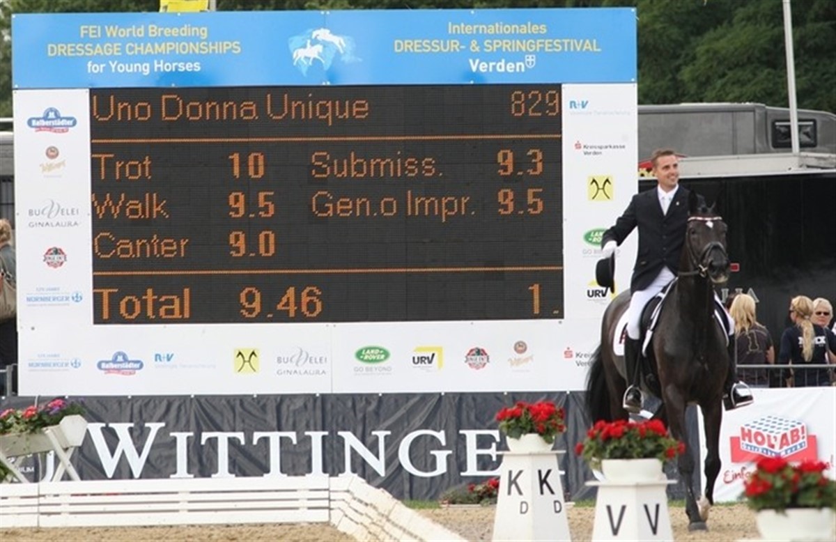 Med en samlet scoret på 9,46 vandt Andreas Helgstrand og Donna Unique den indledende klasse for 6-årige dressurheste. For traven blev Donna Unique belønnet med intet mindre end et 10-tal. Skridten udløste 9,5 og traven 9,0. For ridelighed gav dommerne 9,3 og det samlede indtryk blev på 9,5. Afkommene efter Blue Hors Don Schufro har gjort det fantastisk i 6-års kvalifikationen. Vinderen UNO Donna Unique er en datter af Don Schufro og det er oldenburgerhoppen Rebelle også. Hun blev flot redet af Maria A. Andersen til 8,4 point og en niende plads. Don Schufro er endvidere morfar til svenske Deja på 3. pladsen samt Hønnerups Driver og Skovens Rafæl på henholdsvis 5. og 8. pladsen.