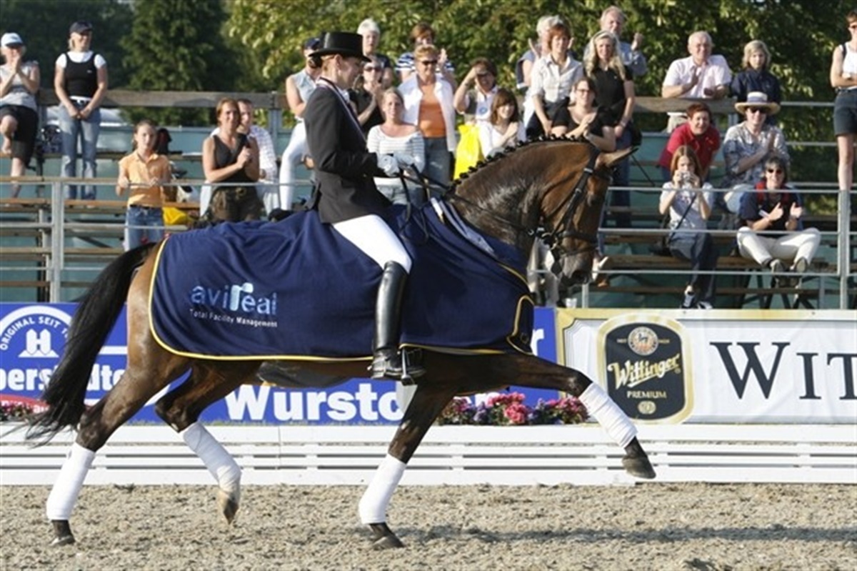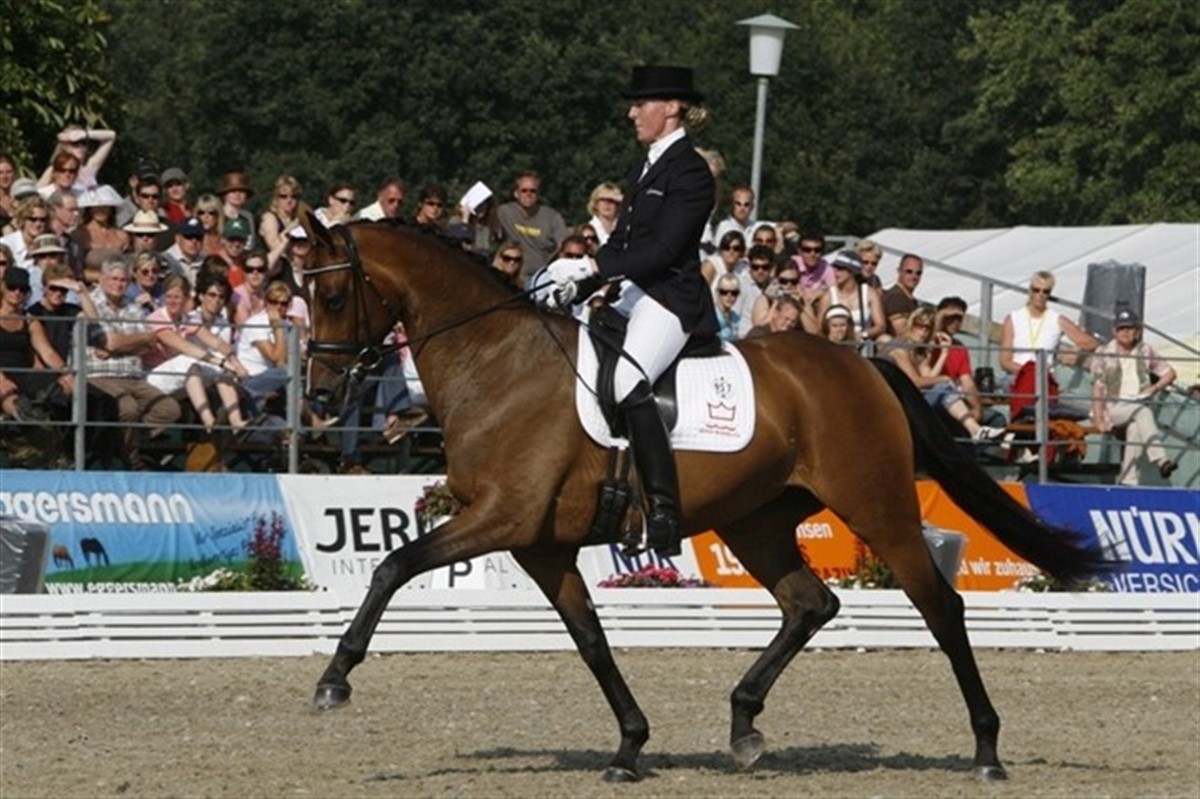 Det var lige ved og næsten for DOrthe Hoeck og den smukke baletdanser Polka Hit Nexen e. Sandro Hit. I VM finalen dansede parret på banen i smuk harmoni, men nerverne var lidt udenpå Polka Hits smukke brune overfrakke, så hun fik ikke helt vist sig optimalt frem i programmet, hvor der indløb et par småfejl. Alligevel måtte publikum og dommere overgive sig til hoppens usdtråling og fantastiske gangarter, og bl.a. honorere hende med et af klassens meget sjældne 9-taller i skridtbevægelsen. Polka Hit Nexen der er opdrættet af Hans Jul Andersen og ejet af Berit Nielsen sluttede med 8,24 points vinder blev Cayenne W en hoppe fra westfalen efter Carabas med 8,82 point bl.a. med et 9-tal for travbevægelsen. Sidste år blev Dorthe også nr. 4 i VM finalen for 5-års hesten, dengang på Treldegaards Shantiana, som hun rider i morgen i 6-års finalen. Placeringsrækkefølgen var: 1) Cayenne W / Susan Pape 8,82 2) Revanche de Rubin / Juliane Brunkhorst 8,52 3) Noble-Dream / Jessica Michel 8,34 4) Polka Hit Nexen / Dorthe S. Hoeck 8,24 5) Roosevelt / Hans Peter Minderhoud 8,22 6) Vivaldo / Mirelle van Kemenade-Witlox 8,12 6) Johnson / Hans Peter Minderhoud 8,12 Læs mere om dommernes udtalelser om hoppen og Dorthes reaktion på VM-placeringen samt se de mange fotos fra VM og læs den omfattende reportage fra Verden i Ridehestens septembernummer.