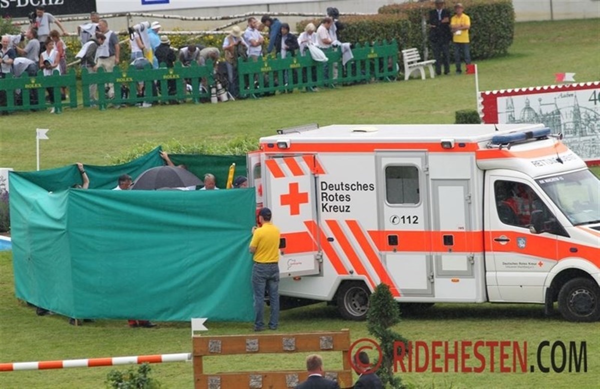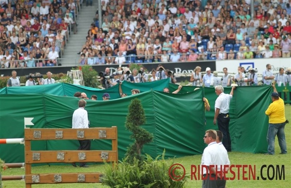 I eftermiddagens Rolex Grand Prix opstod der i eftermiddag i Aachen en uønsket pause, da tyske Katrin Eckermann og den 10-årige hingst Firth of Lorne e. For Pleasure/ Stakkato styrtede på vandgraven. Ekvipagen stod for et lignende styrt på vandgraven i torsdags, men kom hurtigt på benene igen, og fredag vandt de en klasse i Aachen.