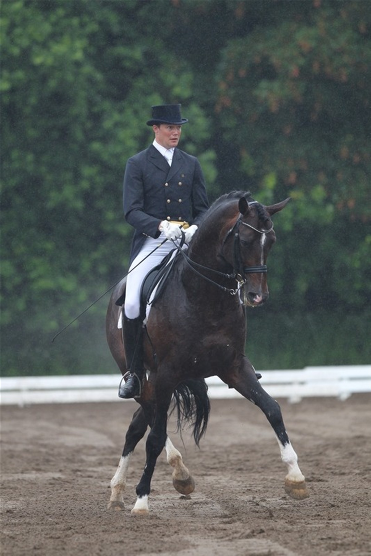 Selvom regnen gør sit til at lægge hindringer i vejen for rytterne, har der alligevel været vist flot ridning i Kolding på stævnets to første dage. I fredagens MB1 blev det til sejr til Henrik Sibbesen og Porsborggårdens Bastian med 69,865%, mens Lykke Reichert og Heslegård's Paganini blev nr. 2 med 67,973% og Dorte Brüggert med Duet Tek scorede 67,162% og dermed en 3. plads. Kolding Rideklubs egen berider, Finn Kryhlmand Hansen, kan også finde tiden til at delatge i dressurklasserne og tog sig af 4. pladsen på Don Juan Højris, der fik 66,486%. I Intermediaire II fredag blev det til en sejr til Thomas D. Larsen og Græsmarkens Don Pedro - ekvipagen fik 70,000%. 2. pladsen gik til Anna Kasprzak og Langkjærgaard's Donna Fetti, der fik 66,667%, mens Rie Møller Jensen og Sundorfs Manilla med 66,579% tog sig af 3. pladsen. Fredag gik også to MA2-klasser. I den første blev det sejr til Jim Rasmussen og Alibi D, med 69.123%, Mette Hviid Schultz og Dawina blev nr. 2 med 68.509% og berider hos Helgstrand Dressage, Maik Kohlschmidt, blev nr. 3 med Connery, der opnåede 68.246%. I den anden MA2 fredag blev det Susanne Barnow og Onassis, der sejrede med 70.088% foran Emily Ward Hansen og Picobello, der opnåede 68.246%. 3. pladsen gik til Bjarne Elefsen, der med Madonna Bally fik 66.930%. Lørdag blev der lagt ud med en MB2 og her sejrede Dorte Brüggert og Duet Tek med 69.211% foran Anne Sofie Damgaard Jensen og Lantanna Tågerup der fik 68.289, mens Finn Kryhlmand Hansen og Don Juan Højris fik 67.895% på 3. pladsen. Den første af to Prix St. Georges-klasser lørdag resulterede i endnu en sejr til Susanne Barnow og Onassis, der opnåede 71.140%. Maik Kohlsmidt blev 2'er med Connery med 65,614% og Finn Kryhlmand Hansen blev nr. 3. med 65,263%. I lørdagens anden Prix St. Georges-klasse blev det Elsebeth Dresler og Grevens Rex, der sejrede med 67.544%, Andrea Woodard og Altair blev 2'er med 66.140% og Jim Rasmussen og Alibi D blev nr. 3 i klassen med 65.439%. Lørdagens Grand Prix-klasse havde i alt 11 ryttere til start. Klassen blev vundet af Jim Rasmussen og Broholm's Highlight med 68.369%, Thomas D. Larsen blev nr. 2 med Græsmarkens Don Pedro med 67.872% og Rie Møller Jensen blev 3'er på den kun 9-årige hoppe Sundorfs Manilla,der scorede 67,092%. Blue Hors' 1. rytter, Sune Hansen kunne ikke helt blive enig med Blue Hors Leredo i fredagens Intermidiare-klasse, men i Grand Prix'en lørdag var der kommet mere styr på det, og ekvipagen scorede 66.879% og en 4. plads. Både fredag og lørdag er der blevet redet kvalifikationer til DRF's mesterskab i dressur for klubhold. Den afgørende finale rides søndag kl. 13. Samtlige resultater og startlister til lørdag kan ses via linket til højre.