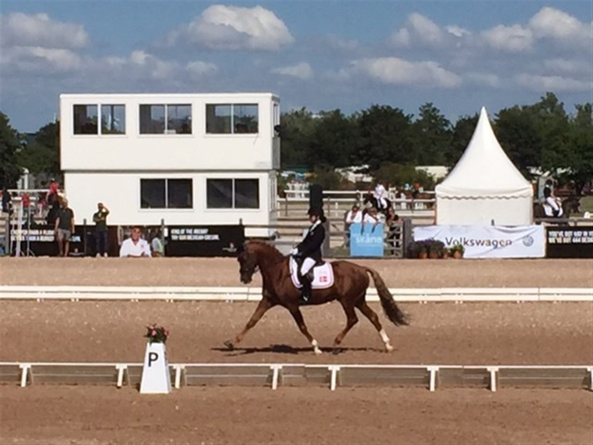 Efter første halvdel af holdkonkurrencen for dressurryttere ved EM for ponyer i Malmø, har de danske ponyryttere lagt sig i spidsen af konkurrencen. Sara Aagaard Hyrm var første dansker på banen og hun red et godt program, der blev dedømt til 72,795%. Herefter var det Louise Fauerholm Christensen og Vegelin´s Goya der skulle på banen, og de viste også at de er i topform med et program, der blev bedømt til 73,487%.