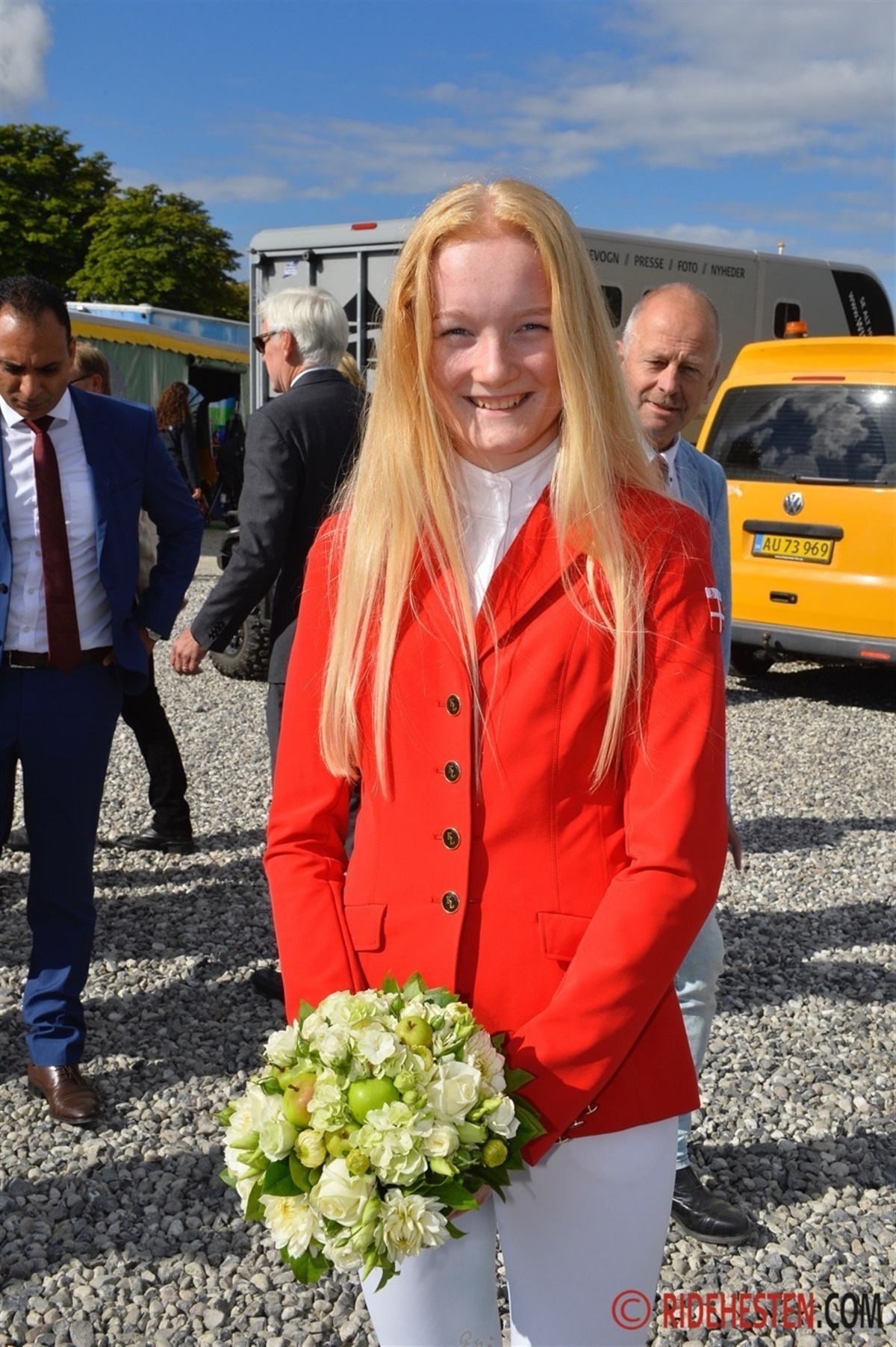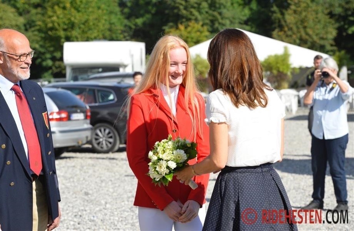 Da H.K.H. Kronprinsesse Mary fredag formiddag gæstede FEI European Championships for Ponies sponsored by Equsana, stod der en lang række formelt klædte mænd og kvinder klar for at byde dem velkommen. Og så en enkelt ung pige med langt, løst hår, rød ridejakke, hvide ridebukser og nypudsede støvler – nemlig Maria Nørregaard Langhoff fra Hedensted Og Omegns Rideklub, der er regerende danmarksmester for I’er-ponyer i springning med ponyen Nikolina.