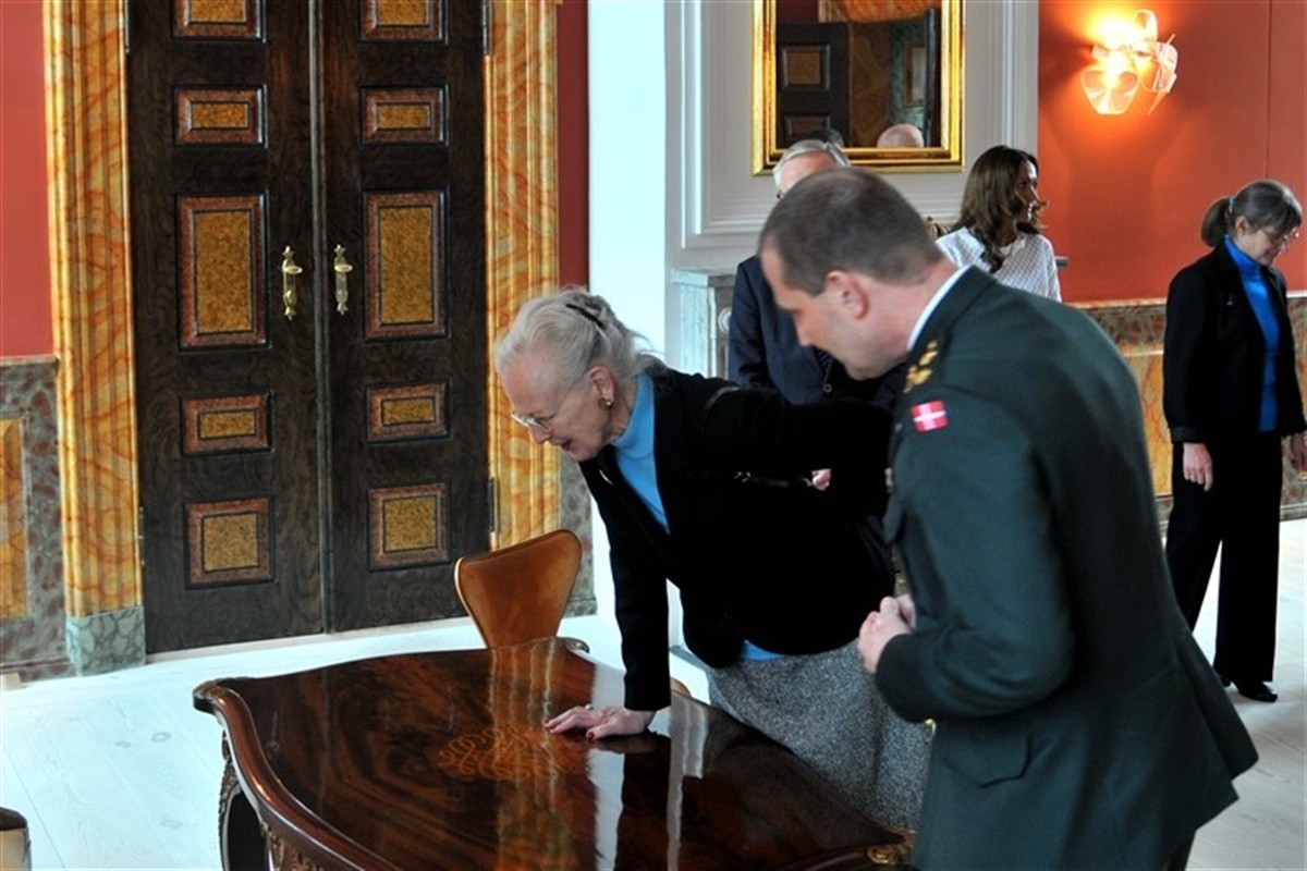 Hos Hærens Officersskole fik Dronningen mulighed for at bese den nyligt renoverede Konge-etage på Frederiksberg Slot. Under besøget var der også forevisning af de tidligere kongelige privatgemakker, som i dag primært anvendes som rekreative lokaler for skolens personel og elever. Lokalerne huser møblement fra Frederik 8.’s tid, som skolen har lånt af Kongehuset og siden restaureret og ompolstret. Dronningen fik desuden forevist skolens undervisningsfaciliteter som er blevet opdateret under hensynstagen til de barokke omgivelser.