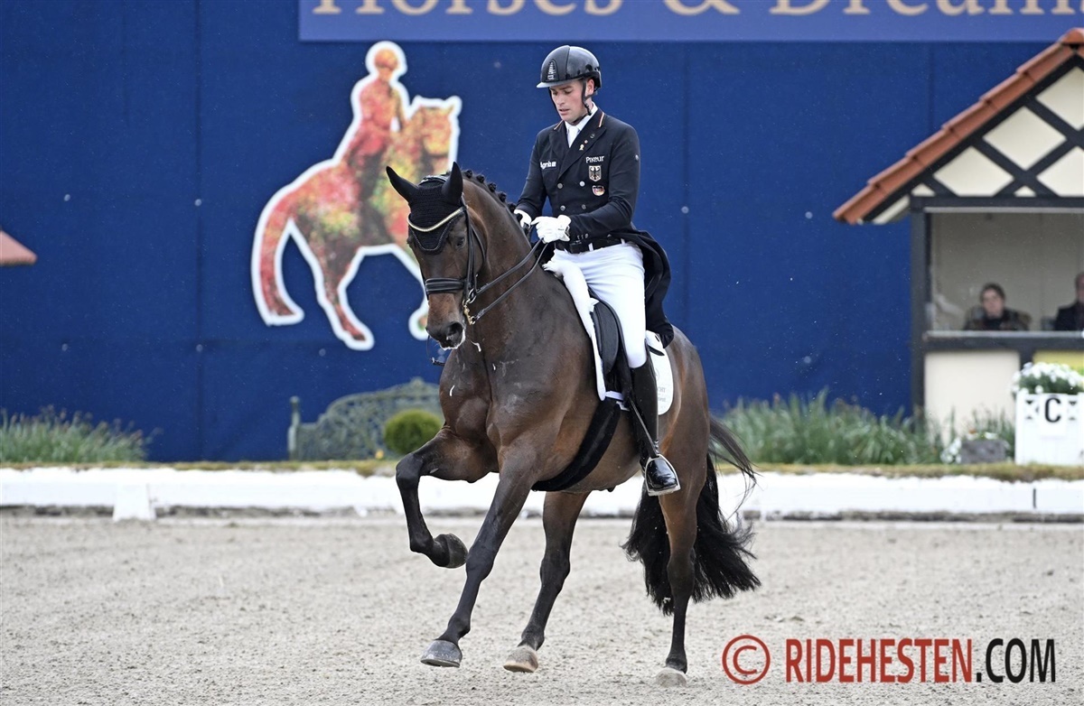 Tyskerne er selvsagt til start her i Hagen, og hjemmebanerytteren Frederic Wandres er som altid repræsenteret. Med den mørkebrune vallak Bluetooth OLD e. Bordeaux/Riccione meldte han sig ind i kampen om de tyske pladser ved OL, da han med 75,32% blev nummer to efter Dujardin.