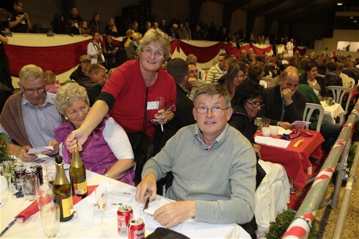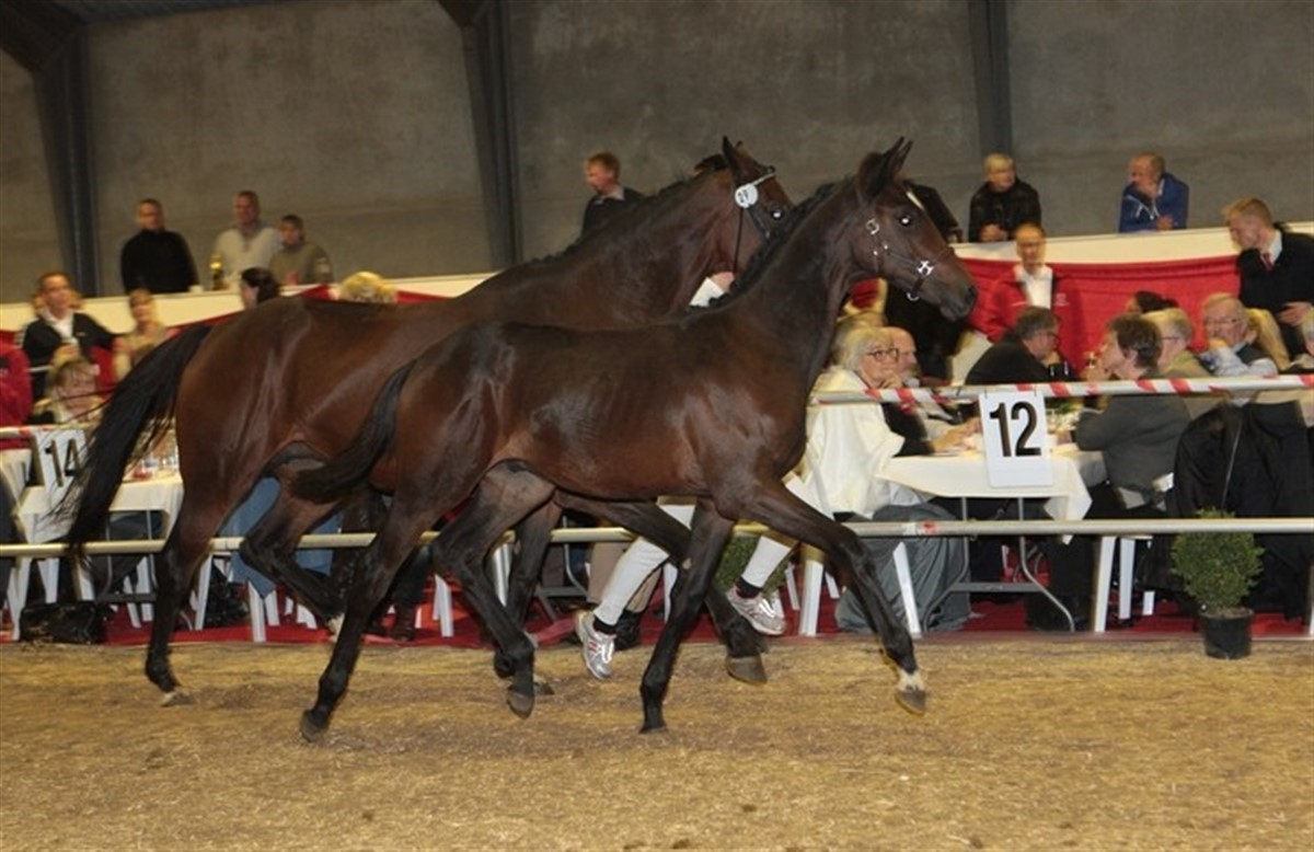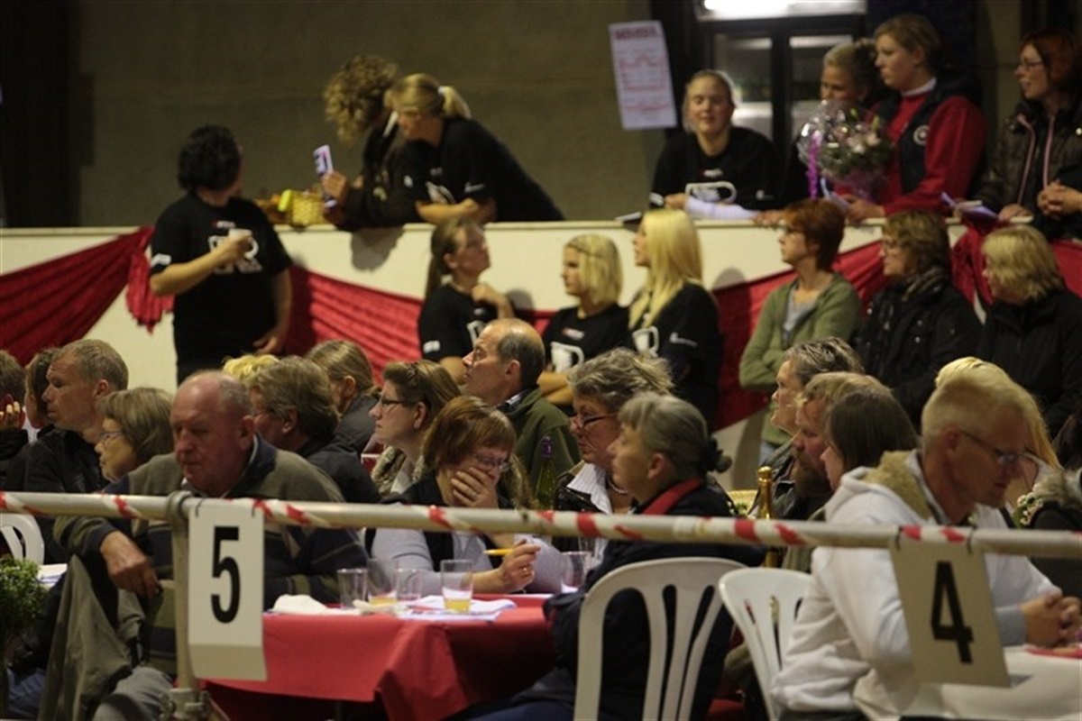 Lørdagens følauktion var et tilløbsstykke, og mange mennesker var mødt op til den efterhånden traditionsrige auktion, som blev afholdt for 5. gang, og det er 3. gang at Dansk Varmblod har valgt at afholdte den på SPIR Rideklub i Randers. Auktionen blev indledt med fremvisningen af to 4 års heste, som tidligere er blev solgt. Den ene, en RDH hoppe, blev vist for hånd, mens den anden, en vallak, blev fremvist under rytter. Disse to heste er i år klar til at gå egnethedstest, og her fik man muligheden for at se, hvad købet af et føl bliver til om nogle år. Herefter blev Poul Erik Fugmann hædret, da han tidligere har købt et føl på auktionen, som i år opnåede den flotte titlet af sølvmedaljehoppe ved Eliteskuet. Det drejer sig om hoppen Borbjergs Zack´Ki, som er efter Blue Hors Zack, og med Michellino som morfar. Inden følauktionen for alvor gik i gang var der salg af de mange flotte sponsorgaver, som i år var skænket af: Lars Uggerby, PAVO, Pedholt Beslagsmedie, MRH Boksen, Viborg Bryghus, Miljøfoder i Viborg, Romalt Maskinstation, Thorsager Foder ApS, THY-MORS Fritid-Rideudstyr, Salvana, Hedebo Angus Farm, Stutteri RV og Helbo Skilte. Derefter gik selve følauktionen i gang, hvor kvaliteten af føllene var rigtig god, både gangarts- og afstamningsmæssigt. Trods en ihærdig indsats fra auktionarius Finn Campen lykkedes det ikke at overgå gennemsnitsprisen fra 2010, men salgsprocenten blev øget i forhold til sidste år. Ud af 37 fremmødte føl, blev der solgt 20 føl under auktionen. Det dyreste føl på auktionen blev katalog nr . 29, Indio Sødovergård, som blev solgt for 37.500 kr. Hingsteføllet er efter Blue Hors Touch Me med Bernstein som morfar. Gennemsnitsprisen for de solgte føl var på 17.650 kr. Lars Uggerby og hans team på SPIR Rideklub i Randers havde pyntet stedet utrolig flot, og Dansk Varmblods hjælpere havde samtidig gjort en stor indsats for at få stablet et godt arrangement på benene, og det lykkedes dem rigtig godt. Om aftenen var der godt 300 spisende gæster, og under auktionen var der pænt fyldt op i ridehallen. Det gode koncept, som Dansk Varmblods region 5 og 6 har fået gjort til en tradition, fortsættes også til næste år, uanset hvad konjunkturerne siger. Havde du ikke mulighed for at deltage på dagen, eller har du fortrudt at du ikke bød på ét af føllene, har du stadigvæk mulighed for at se afstamning og oplysninger om alle føllene på regionernes hjemmesider via linkene til højre. På regionernes hjemmesider kan du også se resultatet fra auktionen i løbet af søndagen. OPDATERET MED WEBTV AF DYRESTE FØL PÅ AUKTIONEN.
