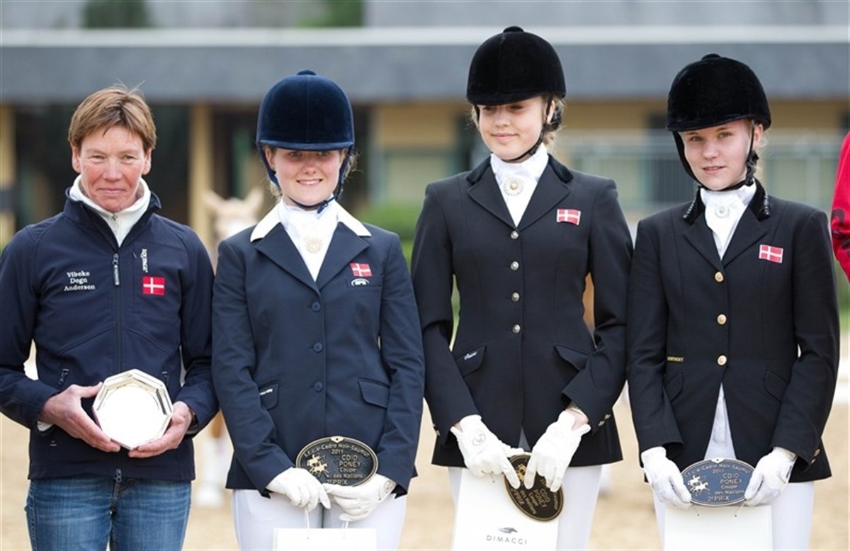 Den danske holdleder for ponyholdet, Vibeke Degn Andersen, kunne i aftes stolt berette, at de dygtige danske dressurpiger opnåede en andenplads i holdkonkurrencen i Saumur, hvor det tyske hold to teten. Danmark på andenpladsen blev efterfulgt af Frankrig og Holland. Det danske holds flotte andenplads skyldes nogle meget fine danske ridt, der første til individuelle placeringer som nr. 6, 8 og 10. Den talentfulde juniorrytter Nanna S. Merrald er ikke let at bide skeer med. I fredagens lilleturs klasse, Saint Georges, tog hun i det internationale felt med flere landsholdsryttere andenpladsen med sin gode dansk varmblodsvallak Millibar e. Milan/Liberty Dane. Den danske seniorlandsholdsrytter, Anne van Olst, der torsdag blev nr. 3 i Grand Prix med Exquis Taikoen, blev fredag nr. 4 i Grand Prix (for kür) med Exquis Clearwater med over 68%.