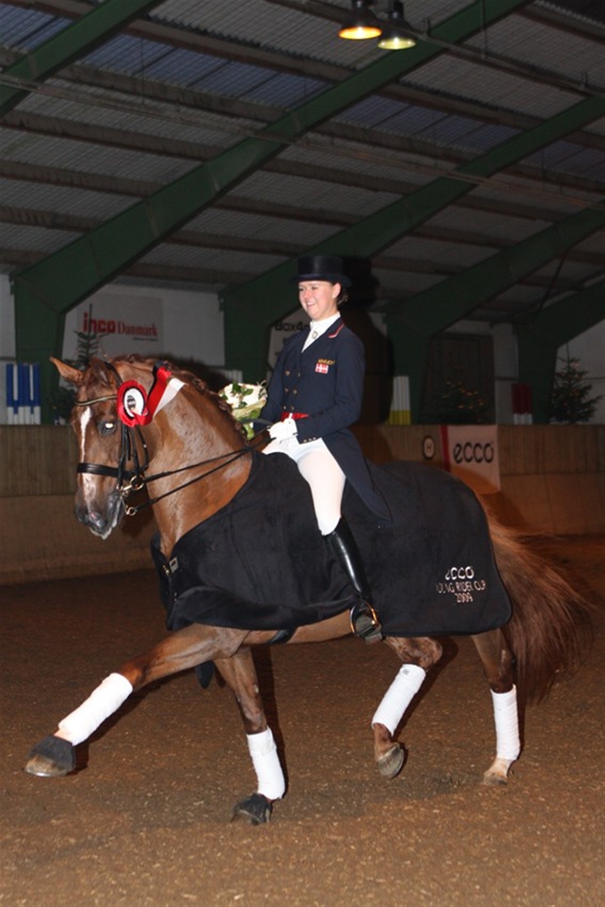 Ecco har med Ecco Cup’en ønsket at fremme den danske ungdomselite indenfor dressursporten. Formålet med cuppen er, at ekvipagerne får mulighed for at dygtiggøre sig til at konkurrere på internationalt niveau. Toppen af den danske dressurs ungdom var samlet for at konkurrere, hvor det i dag gjaldt küren. I går var det Sabrina Barnekow og Fairy Tale, der vandt den 1. afdeling af Ecco Cuppen for kat. 2, over søsteren, Simone, på ponyen Bohemo Geum. Men i dag var rollerne byttet om, da Simone og Bohemo Geum red en flot kür og endte med 71,9%. Det var lige præcis 2% mere end Sabrina og Fairy Tale. De opnåede nemlig 69,9% På tredjepladsen blev det Sara Veronica Raimondi på AJ Golden Jant. Anne Fabricius Tange og ponyen Tim gentog succesen fra i går, og vandt også afdelingen i dag. De viste et super flot og fejlfrit kür-program og blev derved også belønnet af dommerne, som gav ekvipagen 75,5%. Dagens to’er blev ligeledes den samme som i går, nemlig Brooklands Moonwalker med Rikke Lindberg i sadlen. De opnåede 72,9%. Ekvipagen red deres sidste dressurklasse i dag, men kan trods de sørgmodige omstændigheder være stolte af alle deres mange flotte præstationer på de internationale dressurbaner. Nr. 3 blev igen Sabrina Barnekow, men denne gang på 1’er ponyen, Vermont. Vinderen af dagens Ecco Junior Cup Finale blev den tidligere pony-rytter, Nanna Skodborg Merrald på den særdeles velgående varmblodshest, Millibar. Nanna har opnået et hav af præstationer på kat. 1 ponyen Centrum og det ser ud til, at succesen fortsætter, nu hvor hun er kommet op på hest. Ekvipagen slog klassens to’er, Simone Ahlers Pedersen og Cavalér med 0,5%. Nr. 3 med 68,6%, blev Cecilie Stengelshøj Madsen og Laurentius. Der var spænding lige til det sidste i dagens sidste finaleklasse. Anna Kasprzak på den 8-årige velgående vallak, Miami, vandt nemlig gårsdagens 1. afdeling over Anne K. Elkjær-Holm og Bernstein. De red et flot og sikkert program til 69%, 1,9% mere end Anne og Bernstein. Men i dag var det Bernstein og Anne, der sejrede i küren med hele 73,3%. Det var nok til, at ekvipagen kunne kalde sig vindere af Ecco Cup for Young Ridere 09.