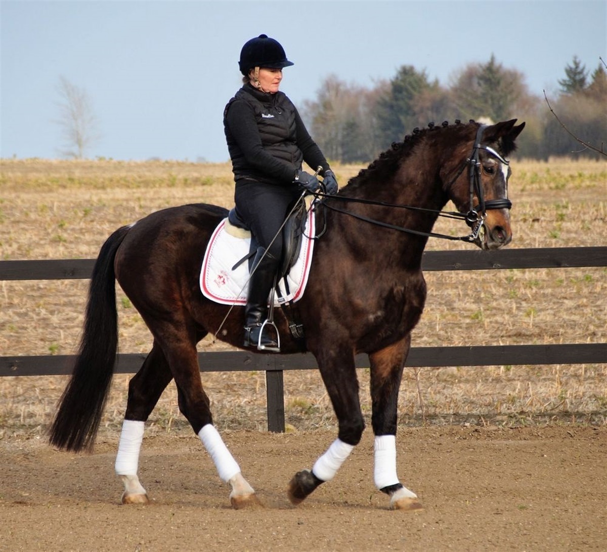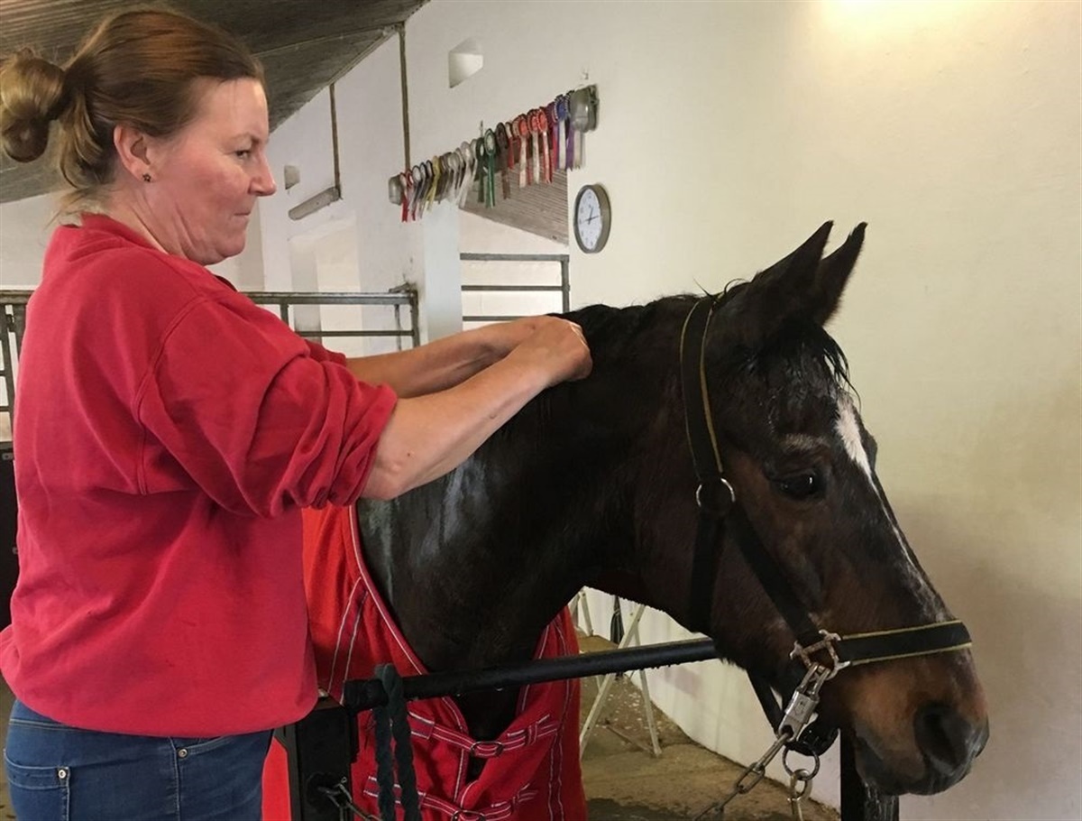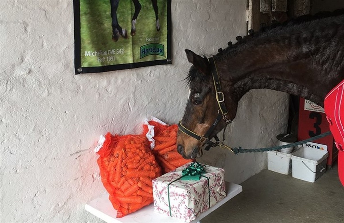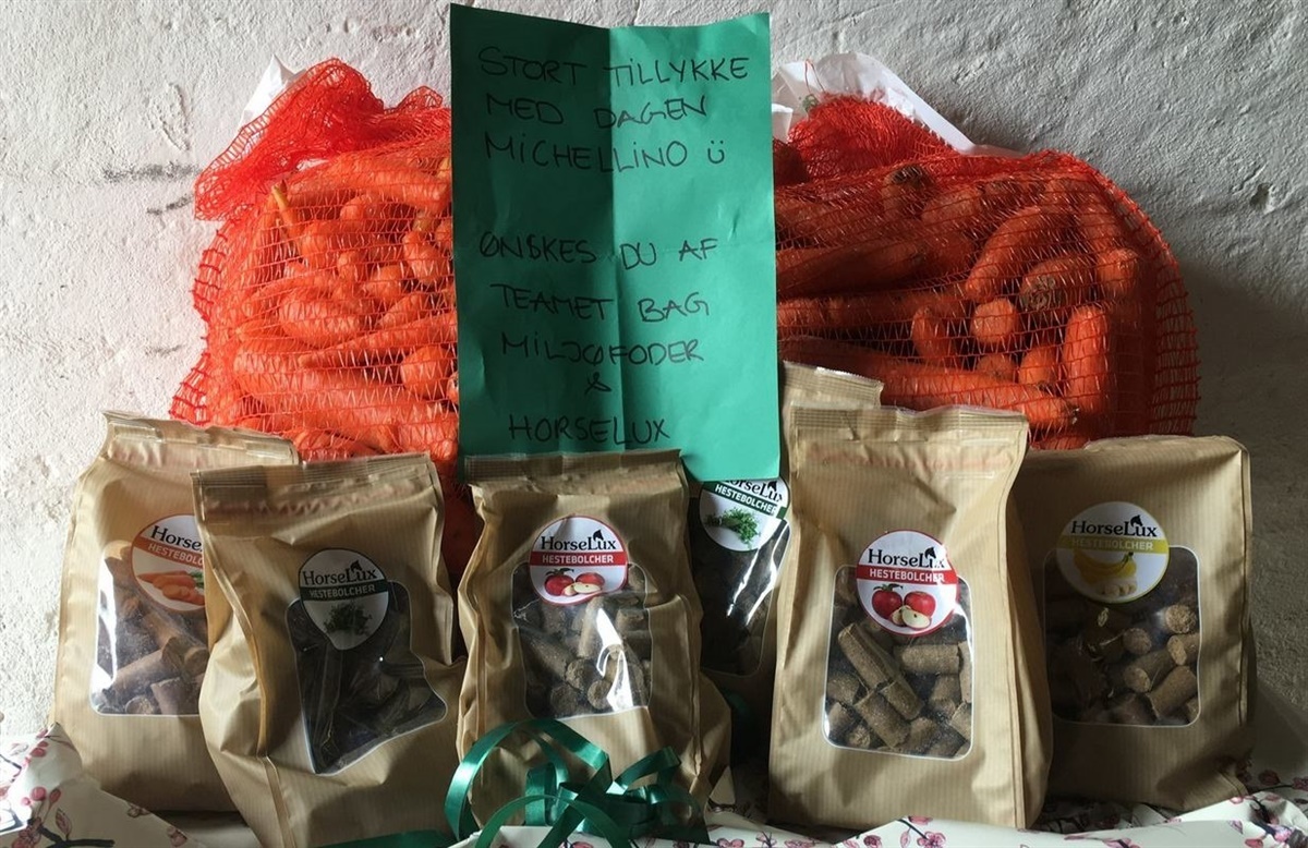 Hos Helle Stordal og Ray Harris på Østergaard ved Tjele har elitehingsten Michellino boet i en årrække, og her har han hvert år fejret sin fødselsdag med gæster og gaver - og også altid med en ridetur. Inden den store dag blev Michellino vasket og flettet, og det var Helle Stordal selv, der red Michellino i går. Han holdes dagligt i form ved foldture, gåture og små rideture.