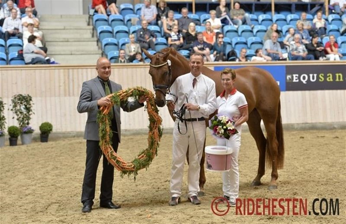 Prisen, samt en flot krans af gulerødder, blev overrakt til Fiontinas ejer og opdrætter af Jacob Jessen, markedschef for Equsana.
