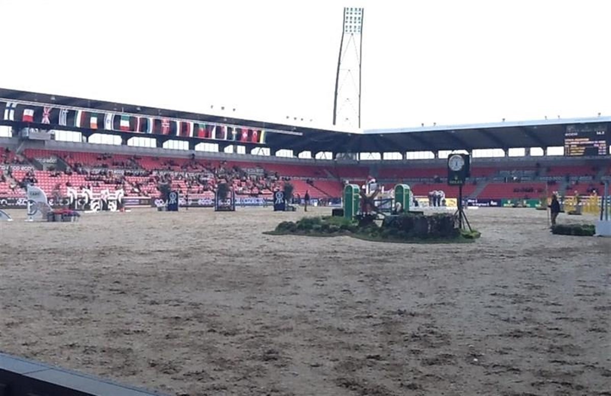 Charlotte Lund og Cartani red en rigtig god tur, men fik to meget lette nedslag på spring 9 og 10, hvor bommene bare trillede. En foreløbig placering som nr. 33 efter 40 ryttere. Roger Yves Bost stadig i front.