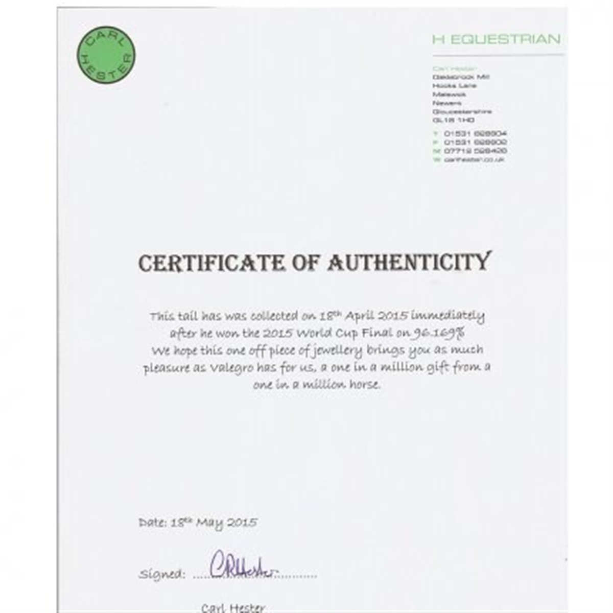Med armbåndet får man også et "Ægthedsbevis" der er underskrevet af selveste Carl Hester, hvorpå der står:
