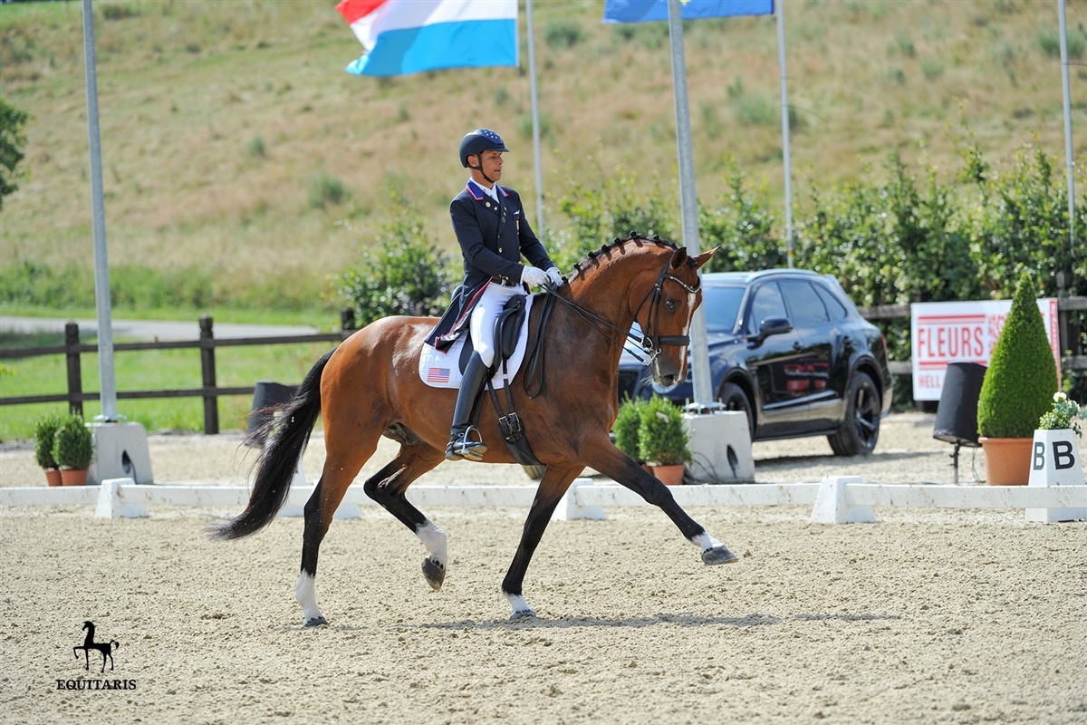 I går kom amerikanske Olivia Lagoy-Weltz ind på tredjepladsen med den danske vallak Lonoir e. De Noir (opdr. Jan og Dorte Rassing), men i dag gik hesten og rystede på hovedet, og da parret nåede piaffe og passage i programmet begyndte hesten at rejse sig, og rytteren valgte at opgive.
