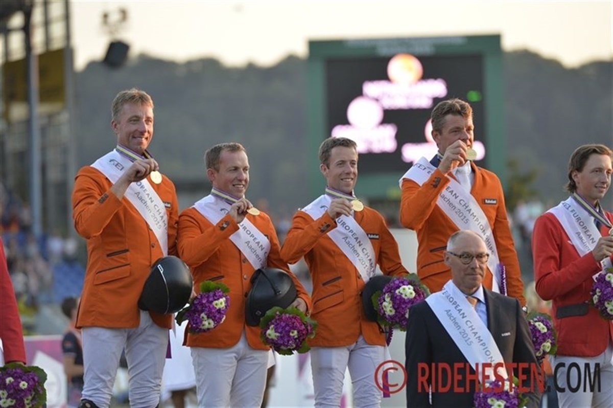 Det blev til hollandsk sejr med 8,82 fejl ialt, da jeroen Dubbeldam og Maiken van der Vleuten red fejlfrit og Jur Vrieling krydsede målstregen med en fejl. Tyskerne havde chancen for at gå forbi, for både Meredith Michaels-Beerbaum og Christian Ahlmann, der begge havde fejl i går, var fejlfrie i dag, men det var Ludger Beerbaum og Daniel Deusser ikke og dermed blev tyskernes mulige guldmedalje til en af sølv. Det franske hold, som havde set så stærke ud før finalen i dag, floppede kollektivt og de røg ned på fjerdepladsen, mens Schweiz red sig ind på bronzepladsen. I den samlede stiling er det spanske Sergio Alvarez Moya der fører foran Ukraines Cassio Rivetti og med Jeroen Dubbedam på 3. pladsen, men hele 17 ryttere har mindre end 8 fejl så alt er helt åbent til søndagens finalerunder.