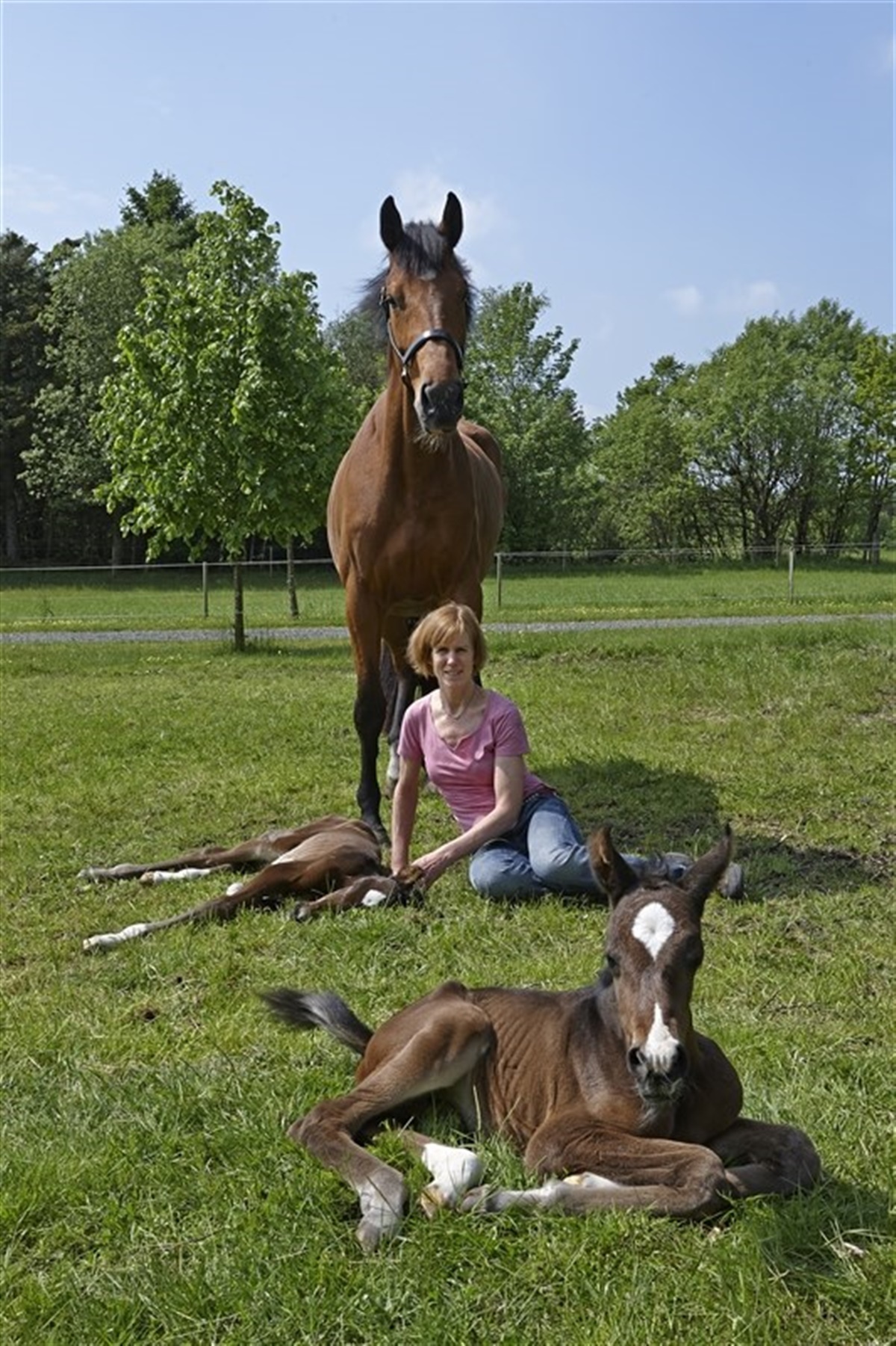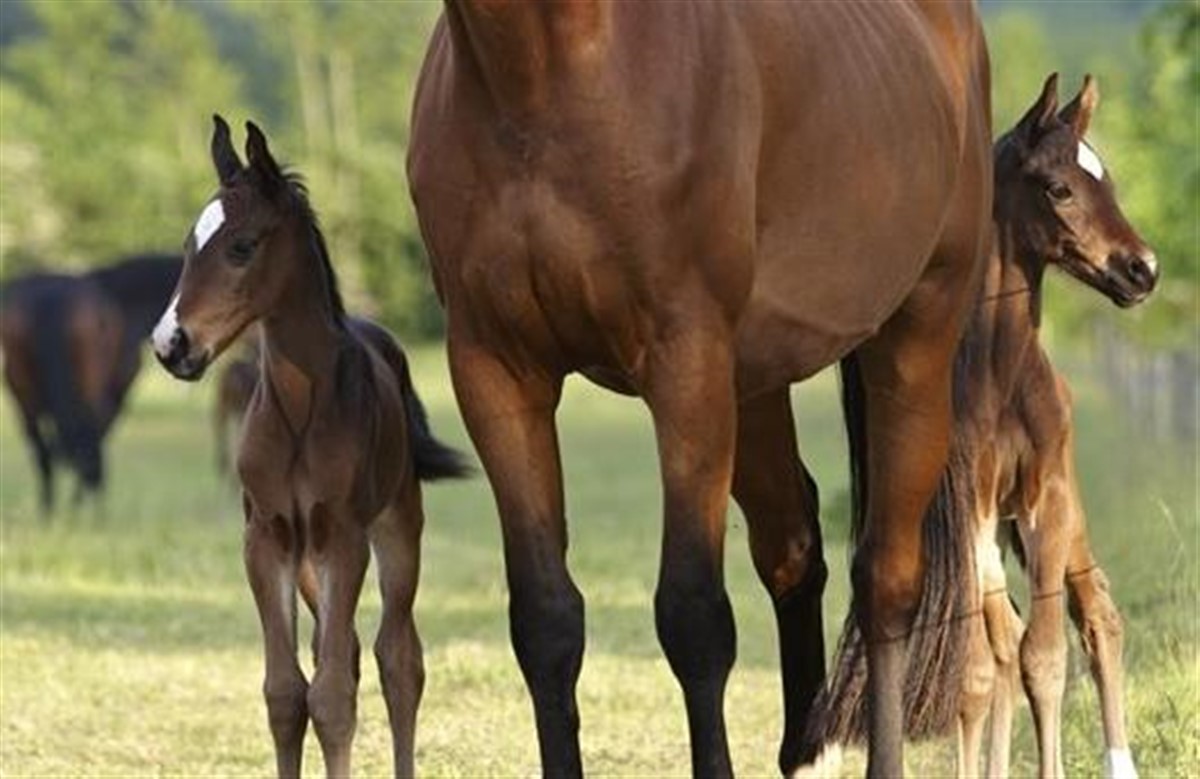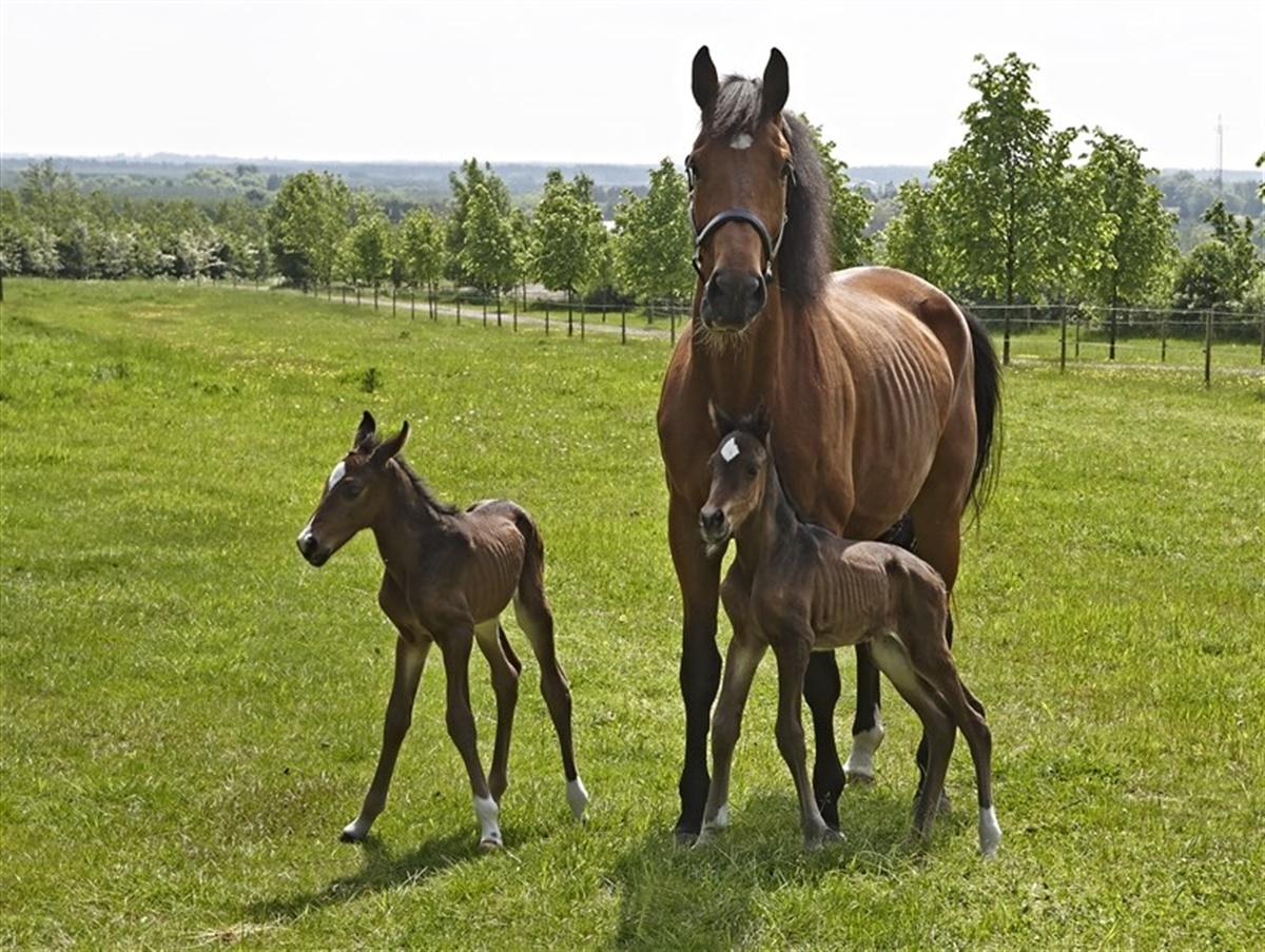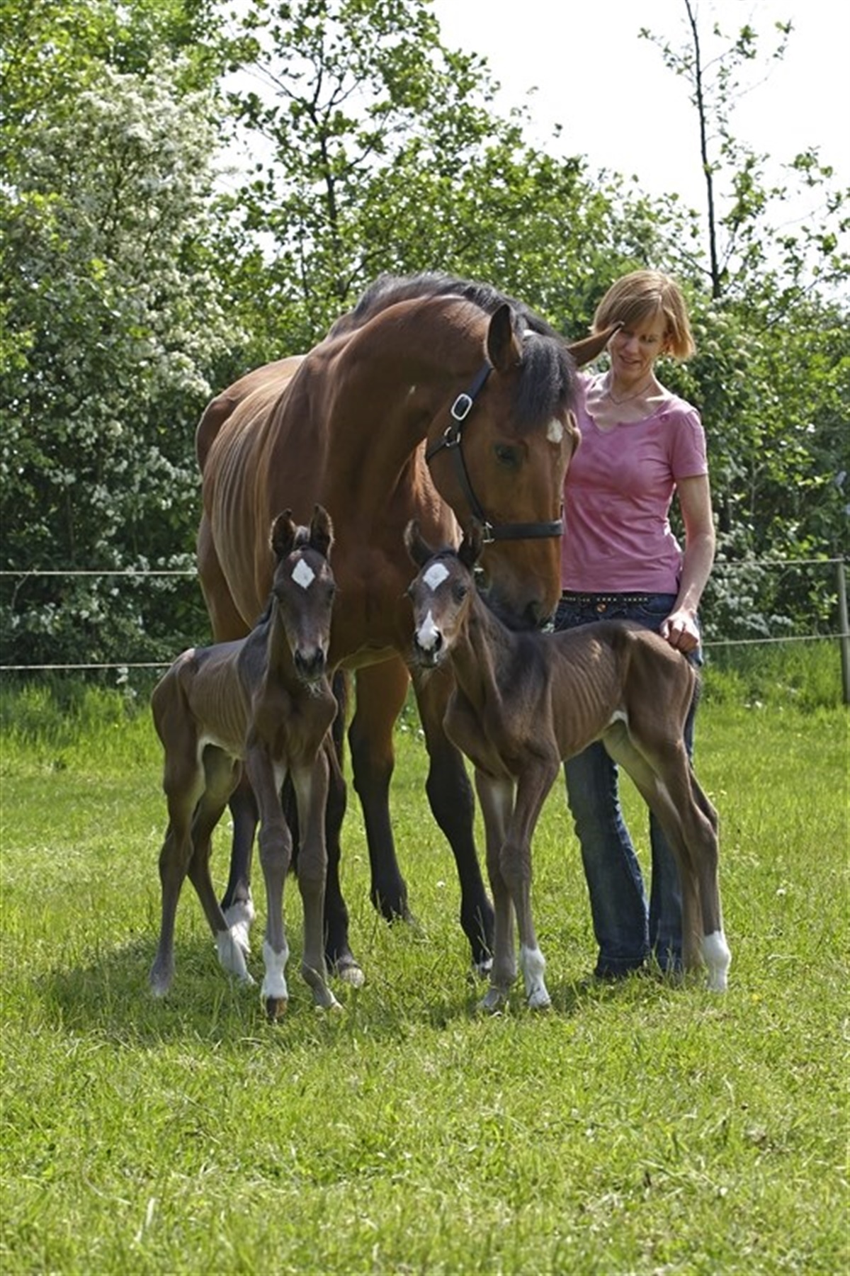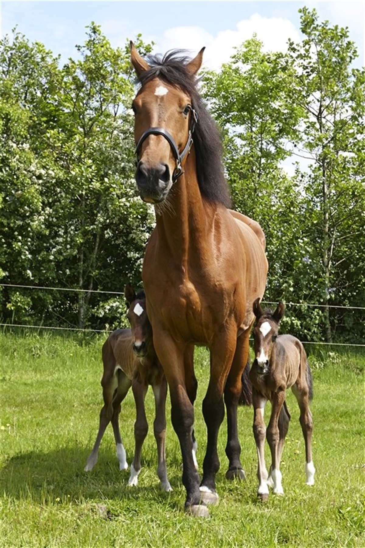 Det første føl hang lidt i bagparten fra fødslen, så hun skulle hjælpes på benene, men efter et par timer havde begge føl diet, og hoppen tager sig kærligt og opmærksomt af begge afkom.