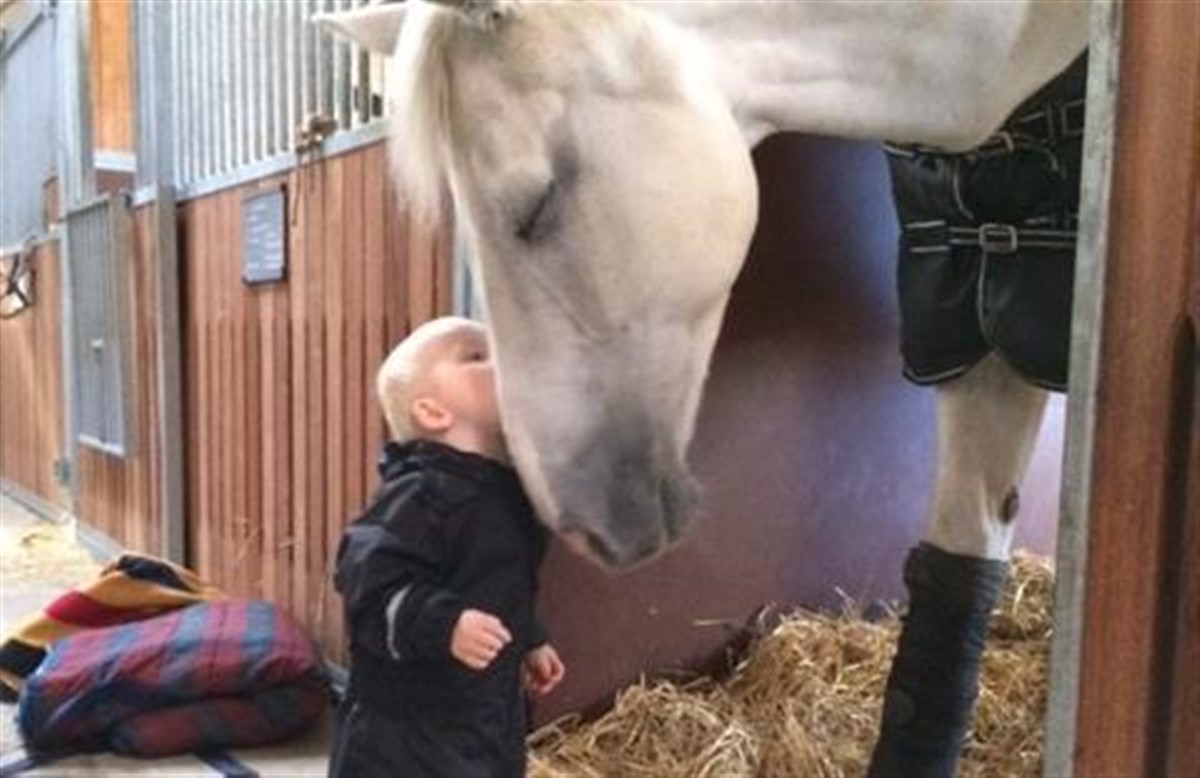 Billedet af 2-årige Nicolas, der kysser en pensioneret konkurrencehest i stalden, gik lige ind hos Ridehesten.coms følgere på Facebook, hvor opslaget er blevet set af mere en 56.000 og delt af 73.