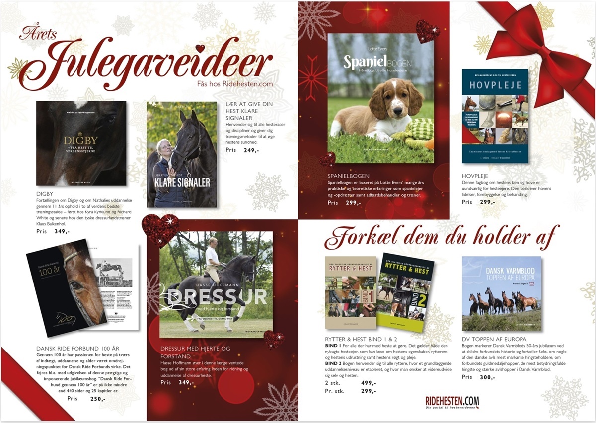Det kan også være en ny bog, som frister, og her svigter udvalget ikke. Der er bl.a. de populære bøger som ”Dressur med hjerte og forstand” fra Hasse Hofmann, ”Hovpleje bogen”, eller ”Dansk Ride forbunds 100 års jubilæumsbog”, som kan blive en flot gave under juletræet. Alle bøger kan købes på webshoppen.