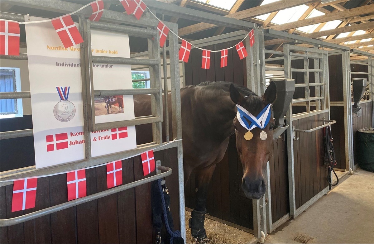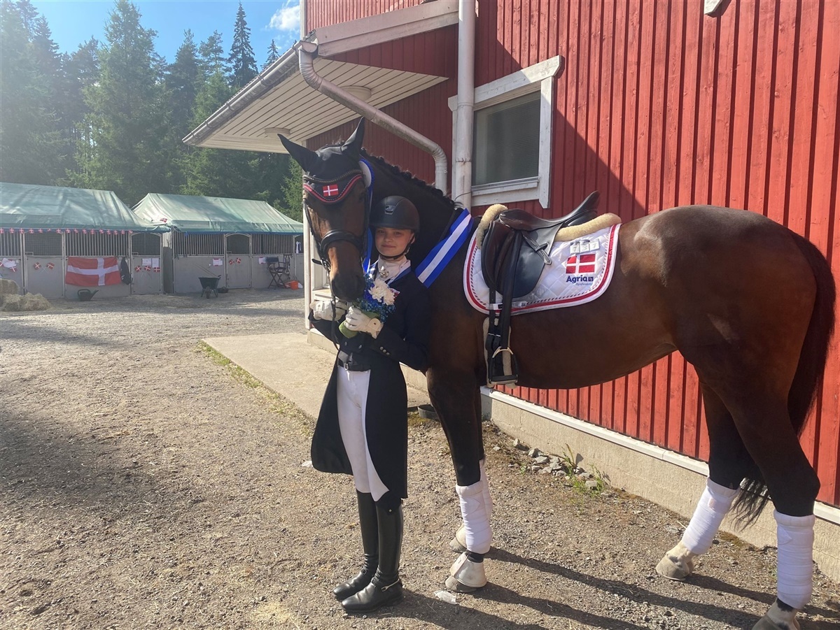 Fredag havde juniorholdet hviledag, og vi kørte ud til en sø for at bade. Solen skinnede fra en skyfri himmel, og det var virkelig varmt, så det var fedt at blive kølet ned. Lørdag var sidste konkurrencedag. Her skulle det individuelle mesterskab afgøres i Kür. De kom til at starte den forkerte musik, da jeg skulle i gang, men det gik virkelig super alligevel, og vi red 74,6 og fik en sølvmedalje. Frida var bare den største kammerat hele vejen igennem stævnet, hun har det mest fantastiske temperament.