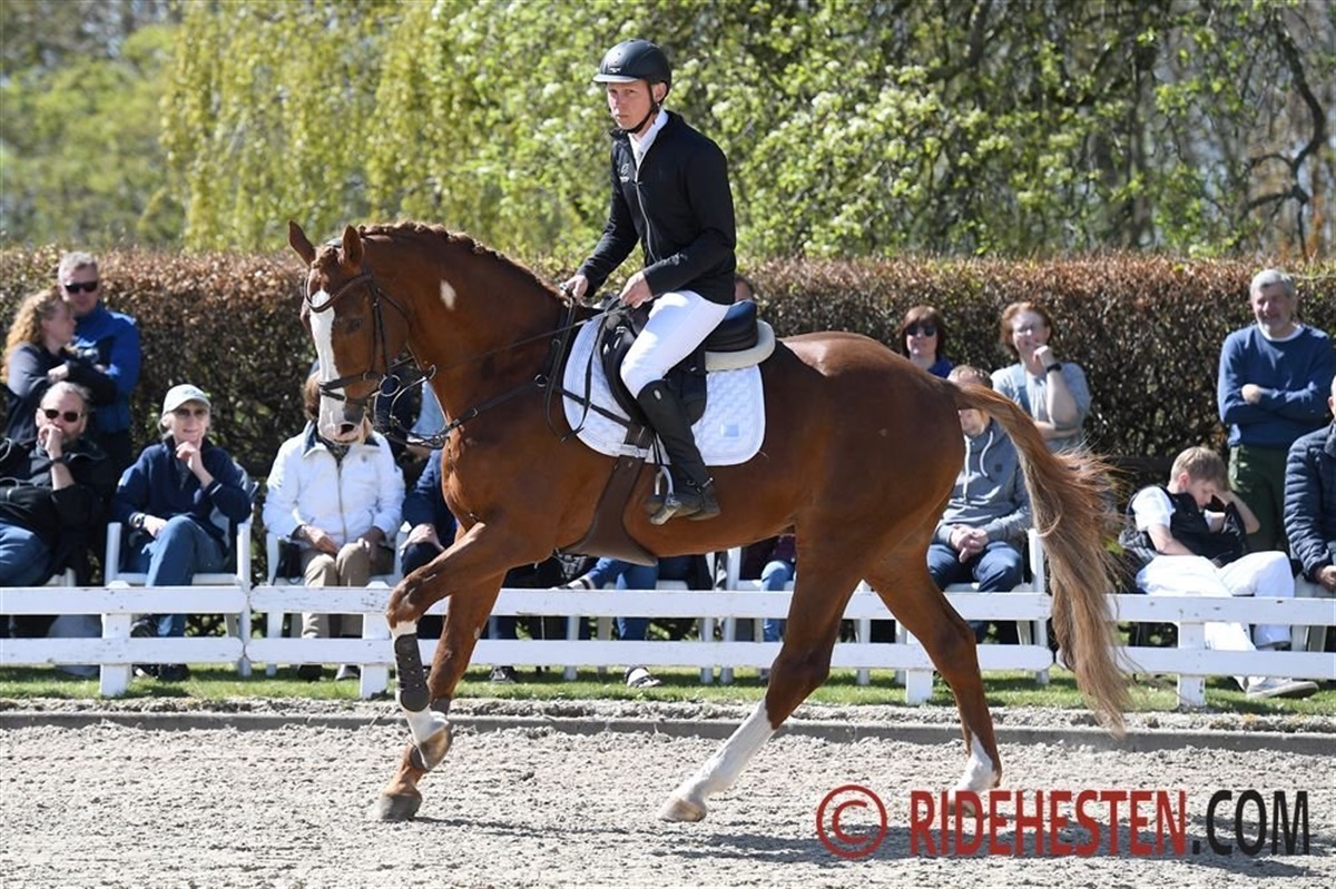 Derefter åbnede Ib fremvisningen i sadlen på den første hingst, nemlig 26-årige Crelido e. Calido I/ Raimondo, som kom på banen sammen med 28-årige Godsend du Reverdy e. Quidam de Revel/ Grand Veneur. Det var imponerende at se de to ældre hingste, som så fremragende ud selv efter mange år som både avlshingste og konkurrenceheste. Begge rides stadig regelmæssigt, hvoraf det er Ib selv, der rider Crelido.