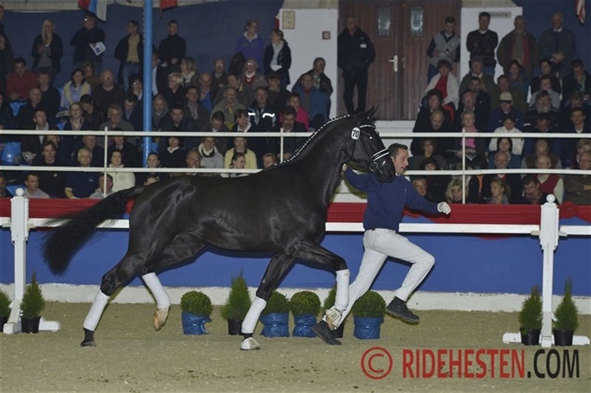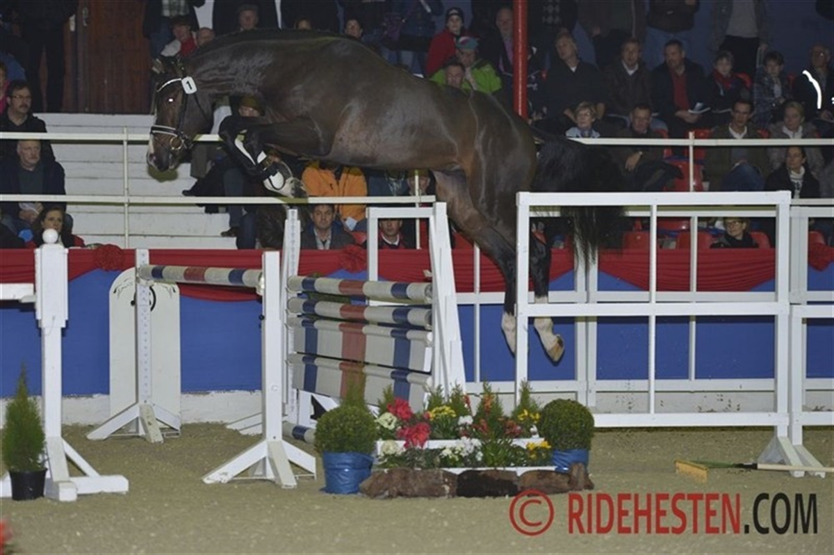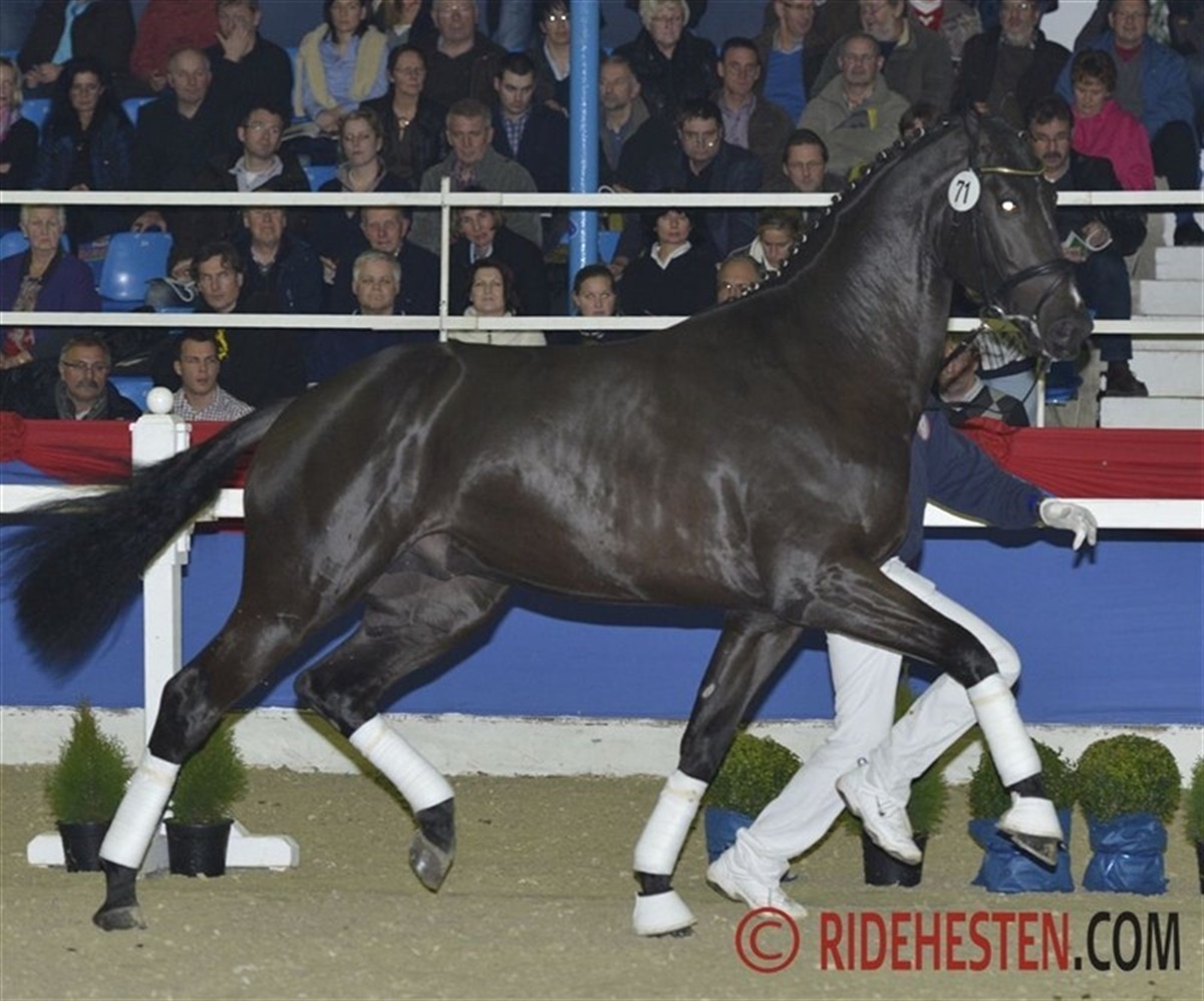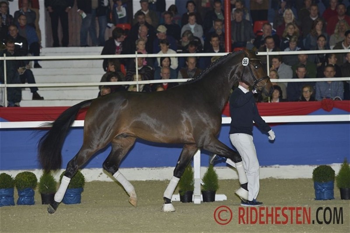i Oldenburg har der de senere år været fremstillet flere danskopdrættede og danskeejede hingste til kåring. Det er også tilfældet ved dette års kåring. Dagen blev indledt med løsspringning af de springbetonede hingste i Oldenburg International, der bekender sig til avl af internationale springheste. Kat. nr. 1 en topmoderne, udtryksfuld Balou du Rouet-søn imponerede med et kraftfuldt afsæt, stor smidighed og en god teknik, kombineret med stor kapacitet. Hingsten blev kåret og efterfølgende også præmieret. Det er derfor glædeligt, at denne hingst er købt af Stald Cajus, der dermed er med i opløbet om fløjpladsen i det springbetonede hold, hvor 15 hingste opnåede kåring og heraf blev de fem præmierede. Blue Hors med kurs mod fløjen? 27 dressurbetonede hingste blev kåret i dag, og iblandt dem to danskopdrættede hingste: kat. 70 e. Wilkens/Zardin Firfod opdrættet af Johan Jepsen, Sommersted og ejet at Jens Peter Aggesen samt kat. 71 e. Zack/Hertug opdrættet af Svend Poulsen, Egtved og ejet af Dressurpferde Kathmann. Begge særdeles funktionelle hingste med et godt udtryk. fra Finland kom en San Amour-søn med Come Back II/Sorel på morsiden - en imponerende hingst med en stor og rummelig travbevægelse med særdeles god aktion. Fløjhingsten skal dog findes blandt de otte præmierede hingste i holdet, og her kommer kåringskommissionen på noget af en opgave, for det er en samling særdeles velgående og smukke hingste, der i morgen kommer i kamp om den eftertragtede fløjplads. En af de helt store favoritter til fløjen er Blue Hors' Vivaldi-søn trukket på Don Schufros helsøster Fabina. Det er en topmoderne, vellinjeret hingst med masser af udtryk. Hingsten bevæger sig med et overskud af energi og aktion med afskub og hele tiden i balance. Publikum var begejstrede over den røde hingst. Målt på publikums begejstring så kommer Blue Hors i hård kamp mod Fürstenball-sønnen med kat. 50. Fürstenball, der selv blev fløjhingst i Oldenburg i 2010, er delvis ejet af Lone Bøgh, og denne årgang er hans første. Hans søn er faderens udtrykte billede, med masser af hingstepræg og et bevægelsesmønster med stor elasticitet, "gummi" og power. På minussiden så er han lidt til den umarkede og kraftige side, men som han bevæger sig! En anden præmiehingst med "danske" aner, som det er værd at holde ekstra øje med i præmieringen i morgen er kat. 65 en Sir Donnerhall II/Don Schufro-søn der fremstår topmoderne med et bevægelsesforløb helt efter opskriften på en Grand Prix-hest: Masser af løft, afskub og elastik også når han blot travede roligt rundt i hallen og en stor, elastisk fri trav og en super galop dertil.