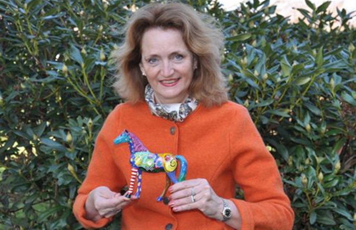- Gaven måtte naturligvis blive en hest, ikke en levende, men selvfølgelig i special udformning, fortæller Aff Ingdam-Lindgren, INGDAM’S. En hest smukt dekoreret i decoupagelignende mønstre i glade farver. Hesten er malet af kunstneren Kerstin Cizmowski i serien Art of the City, der er illustreret af internationale kunstnere, og hvert eksemplar er nummereret. - Vi syntes, decoupage-hesten stemte gevaldigt fint overens med Dronningens mange spændende decoupageværker, vi har haft fornøjelsen at se på udstillinger og som bogillustrationer, bla i H.C. Andersens “Snedronningen”, fortæller Aff. Dronningen var som barn og ung glad for at ride tidligt om morgenen i skovene ved Fredensborg og Gråsten. I bogen “De kongelige heste” skrevet af journalist og cand. mag. Eva Nitschke kan man dog finde forklaringen på, hvorfor dronningen ikke fortsatte sin ridning: “En dugfrisk skov med råvildt, der står og græsser i lysningen – det er fuldkommen bedårende. Men jeg var altså ikke tilstrækkelig interesseret i ridning til at tage det sure med. Og det sure var at ride rundt og rundt i ridehuset på Christiansborg. De samme syv gråspurve lettede fra de samme tre hestepærer, hver gang, man kom rundt i hjørnet af ridehuset. Og lige gråt og råt var der. Åh, bare lyden af disse gråspurve,« siger Dronning Margrethe i bogen. At Dronningen har fundet mange andre interesser, må nok siges, konstaterer Aff Ingdam-Lindgren, som håber, den farveglade decoupage-inspirerede hest må lede tankerne til varme sommermorgener og dejlige minder.