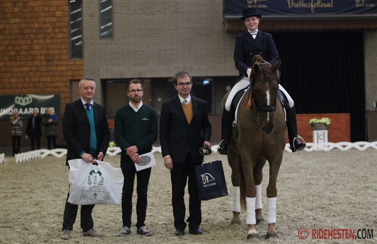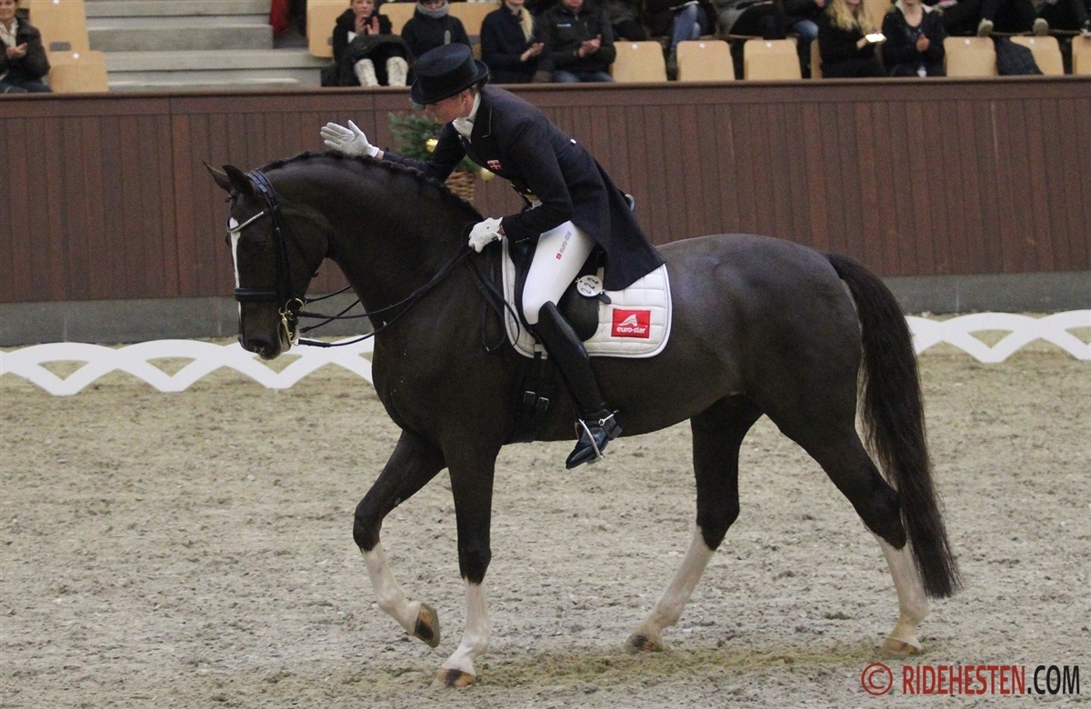 I går distancerede Ditte Mikkelsen og 11-årige Don Rodian e. Blue Hors Don Romantic/ Lillemarkens Arkibal (opdr. Mette Krabbesmark Jepsen) nærmeste konkurrent med over 3 procentpoint i den indledende Intermediaiere I af finalen i Bundgaard Byg Cup ved Blue Hors Dressurfestival, og i søndagens kürfinale - bedømt af Niels-Erik Bøchman, Jesper Holst Hansen og Helle Krasnik Trolle - viste ekvipagen sig igen uovervindelig. De leverede i dag en kürpræstation med stor sikkerhed til 75, 833% og dermed favoritsejr i Bundgaard Byg Cup med sammenlagt 150,131 procentpoint. 31-årige Ditte Mikkelsen, der til dagligt arbejder som fængelsesbetjent, har Don Rodian som føl og har selv uddannet hesten fra unghest og til vordende Grand Prix-debutant.