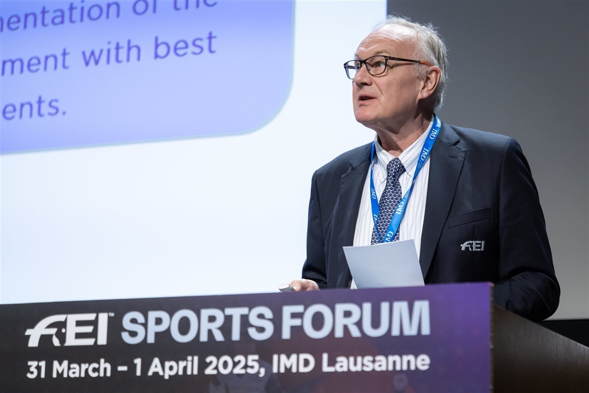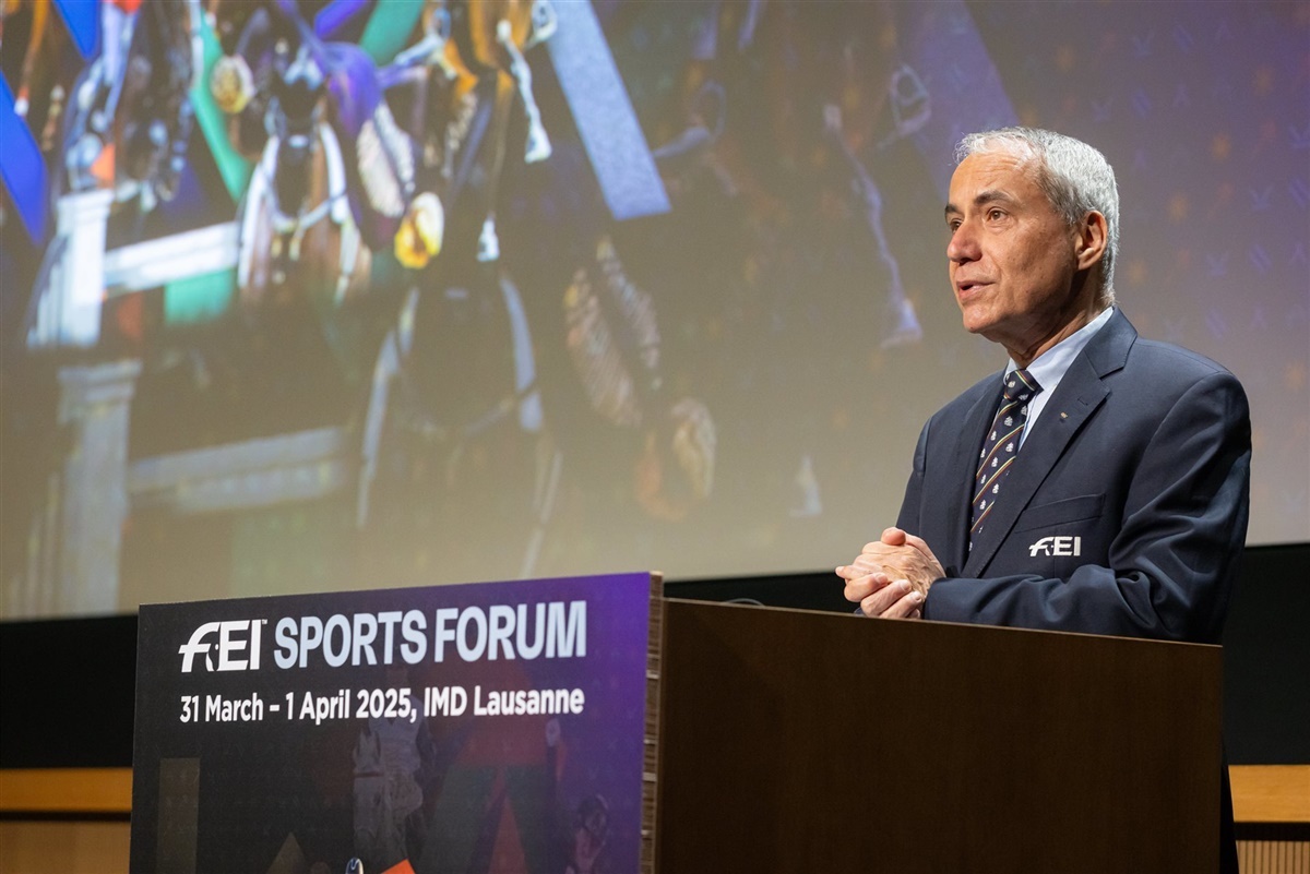 På første dag af FEI Sportsforum 2025 bød FEI's præsident Ingmar De Vos næsten 300 deltagere velkommen til den 14. udgave, ligesom der var et stort online publikum, der fulgte med over hele verden. I sin åbningstale slog Ingmar De Vos fast, at hestevelfærd fortsat er et centralt fokuspunkt for FEI, og han understregede nødvendigheden af at sætte hestenes velbefindende før sportslig præstation:
