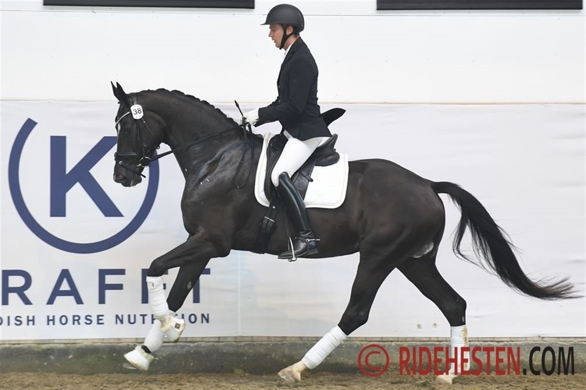 Kat.nr. 38 Feine Galicia V. e. Grand Galaxy Win/Gribaldi, opdrættet og ejet af Iben Leere Kamp, er ud af en hoppestamme, der har leveret mange topheste, bl.a. fløjhingsten Valløs Baron og Grand Prix-hesten Gallardo V. Det er en utrolig flot og vellinjeret 4-års hoppe med store åbne partier, en smidig overlinje og tre meget smidige gangarter og ikke mindst en helt fantastisk ridelighed og kapacitet.