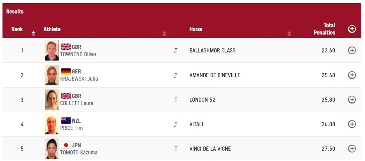 I den individuelle konkurrence er det Oliver Townend, der er bedst, med 23,6 strafpoint, mens det i holdkonkurrencen altså er Storbritannien, der samlet har 78,3 strafpoint. Andenpladsen i holdkonkurrencen foreløbigt er Australiens, og de har samlet 96,2 strafpoint.