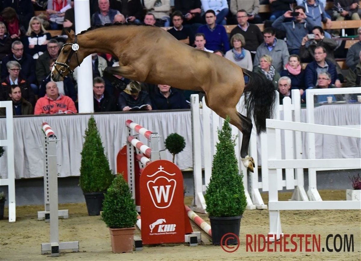 Fem præmiehingste fandt kåringskommissionen blandt de springbetonede hingste, som var en fornøjelse at følge i løsspringningen på kåringens anden dag. Af de fem blev tre hingste udpeget til slutringen. Det var også tre helt fremragende hingste, som havde vist kapacitet i springning og ikke mindst intelligent springning med godt overblik. Som det var tilfældet ved kåringen i Oldenburg var det en For Pleasure-søn, som imponerede i Westfalen trukket på en datter af Nabab de Reve/Cassini II. Modsat fløjhingsten i dressur, som er registreret i Hannover, var fløjhingsten i springning født og registreret i Westfalen, et forhold, som også blev understreget af forbundets avlsleder, der også konstaterede, at hesteavlen er global, og det drejer sig om at kåre og fremhæve de bedste.