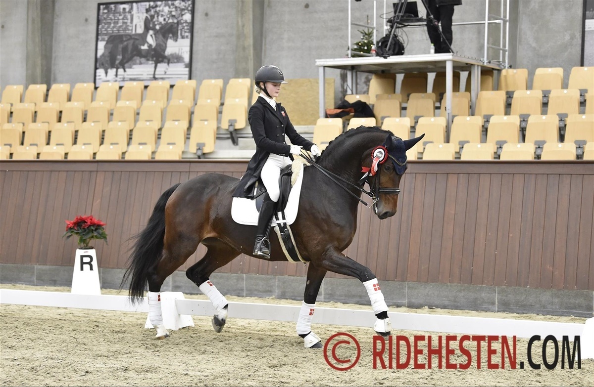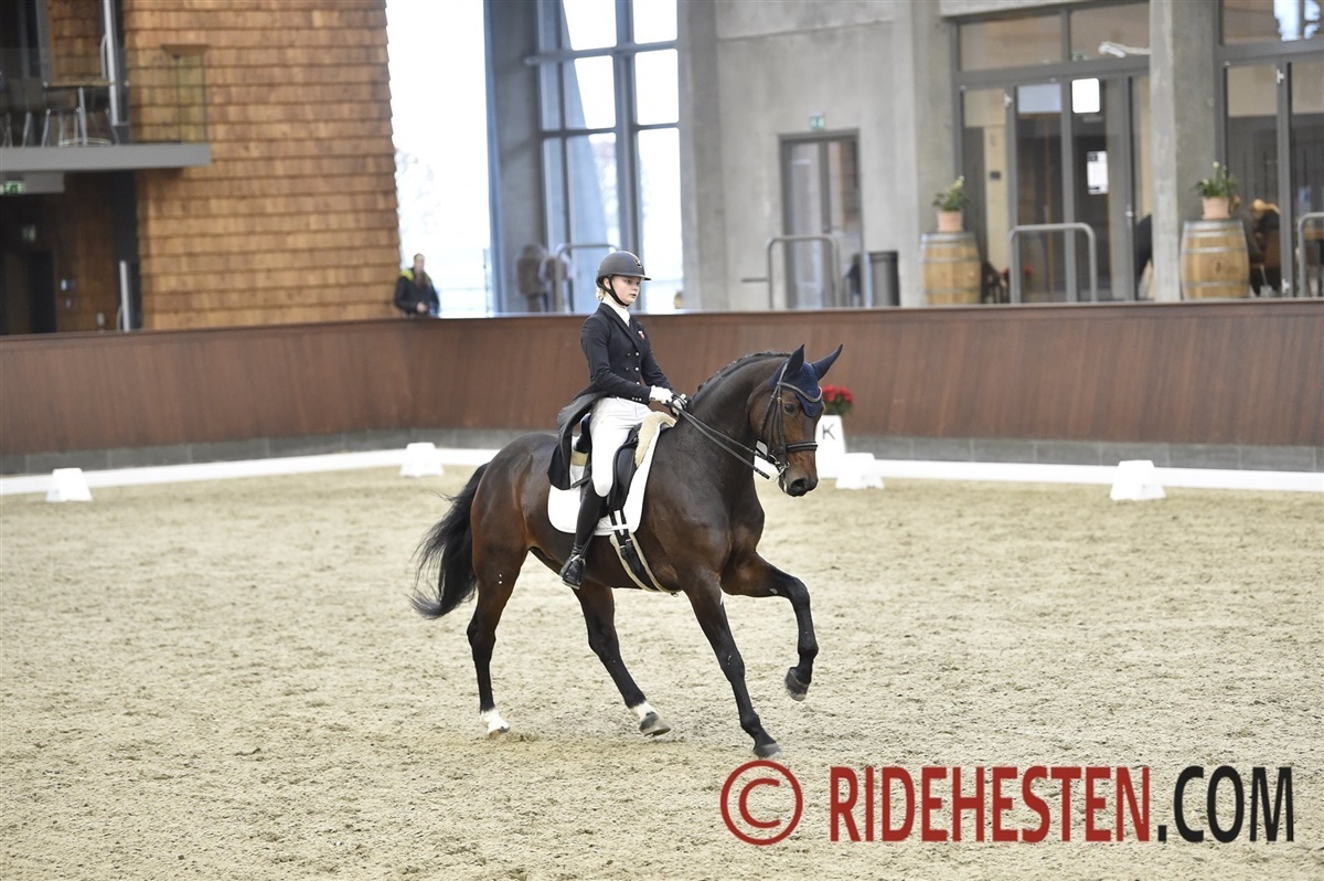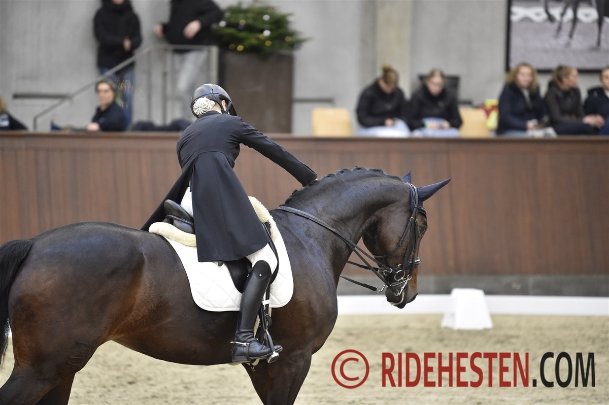 Ecco Finalen er altid et helt særligt stævne med en helt speciel stemning. Rammerne på Blue Hors er super gode, og vi ryttere er mere afslappede, da det jo er mega sejt bare at nå hertil. Jeg havde i år valgt at ride opvarmningsklassen om fredagen, da hun spændte en del op for mig sidste år, og det viste sig at være en rigtig god idé, for i opvarmningsklassen blev hun igen meget spændt, og det går især ud over kvaliteten i galopprogrammet. Jeg talte med min træner Pernille Ørum om, hvilken strategi vi skulle vælge, og vi valgte at gå all in med hut og mindre sporer for at få lagt en dæmper på hende. Det viste sig at være en rigtig god strategi, for jeg red en virkelig god og sikker tur om lørdagen til over 71% og blev nummer fire. De seks bedste kom ind til en festlig præmieoverrækkelse i hallen.