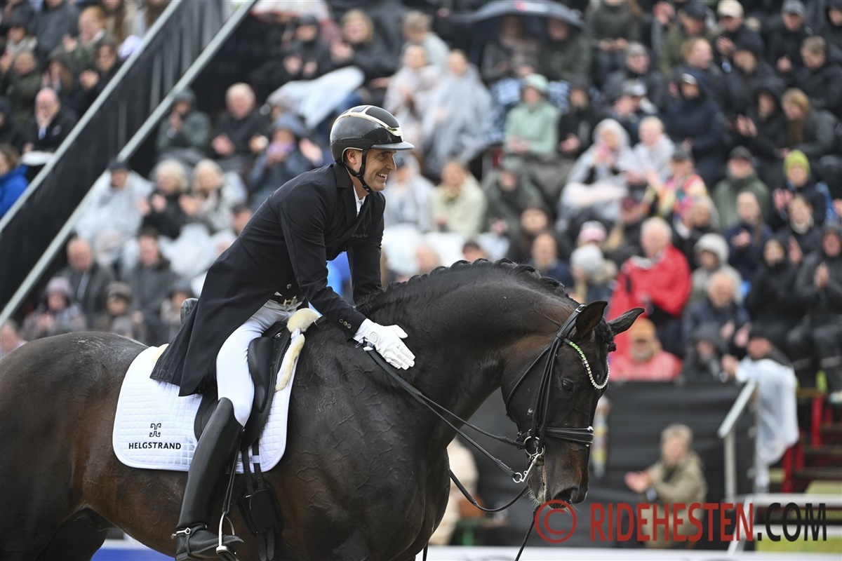 Den tredje og sidste danske rytter i aktion i klassen i dag, var Andreas Helgstrand, som red ind på banen med en veloplagt Jovian e. Apache/Tango. Den imponerende hingst virkede til at have masser af energi i dag, og indimellem gik det lidt udover programmet, hvor særligt piaffe-momenterne desværre ikke gav så høje point i dag.
