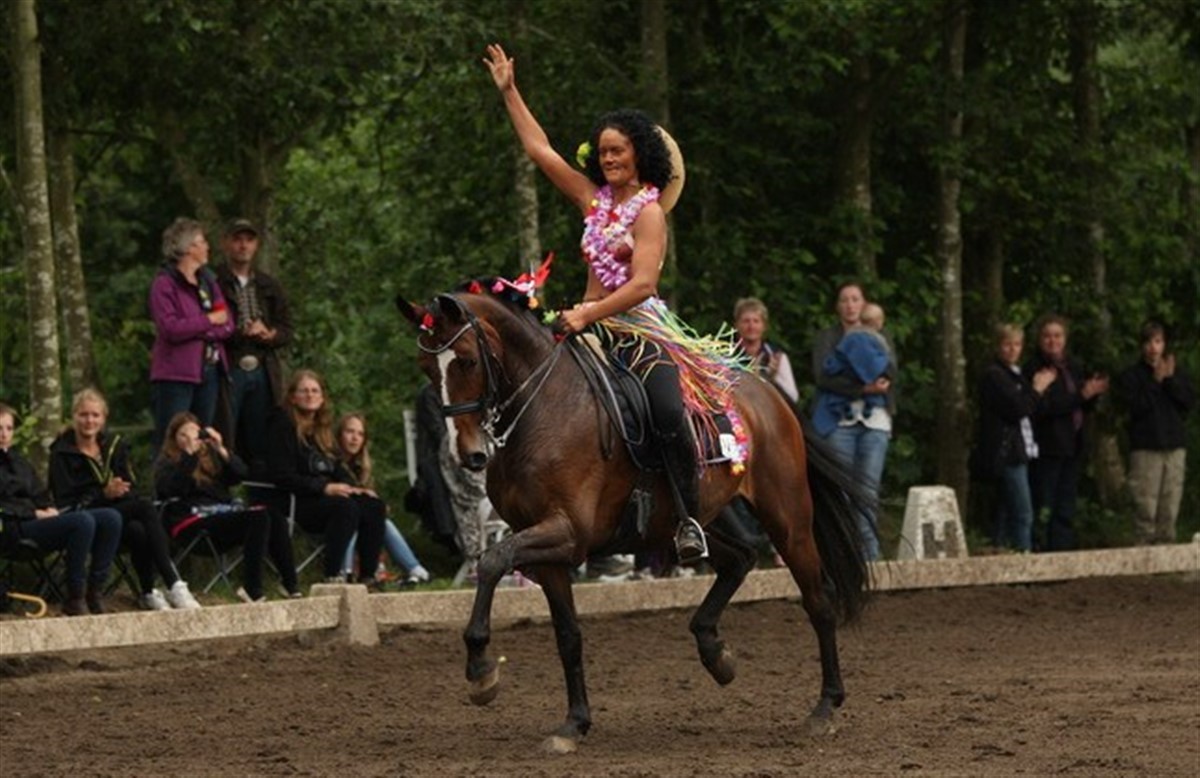 Det var nogle fantastiske kostumer rytterne i dag bar, da de deltog i kostume-küren ved Jysk Rideuge. Küren blev vundet af Hawaii-jomfruen, måske bedre kendt som Henriette Dam Vestergaard på Leopold e. Loudini. Andenpladsen gik til mariehønen Kirstine Ø. Kortbæk på Candalaus e. Crelido, og tredjepladsen gik til Anne Laursen på Brohaves Cæsar e. Blue Hors Romancier, og parret var klædt ud som Caroline Wozniacki og Piotr.