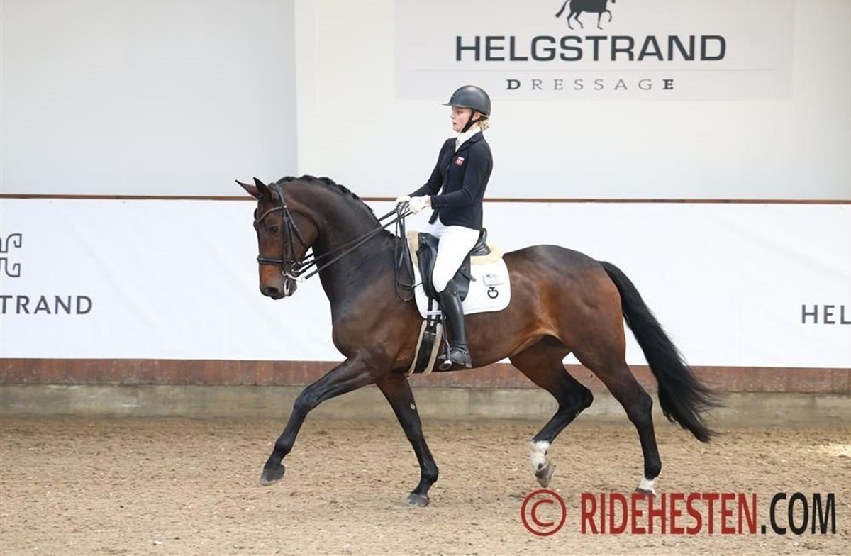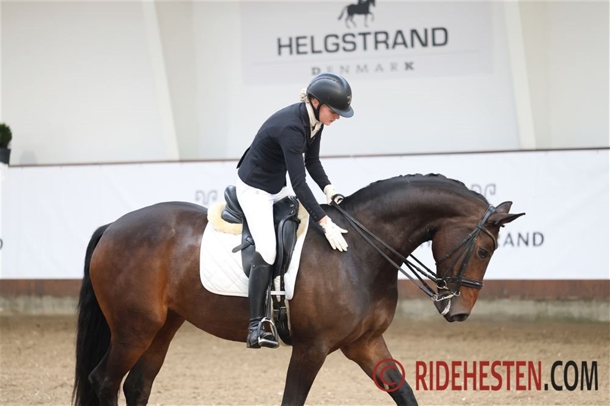 Frida er en hest med en relativ høj tænding og mest af alt, så ELSKER hun at være til stævne. Så da turen gik til B-stævne i Esbjerg her i januar, så kunne hun næsten ikke være i sig selv af begejstring over at være af sted igen. Det er jo fedt med en hest, der har sådan en lyst til at gå, men det kan også være lidt krævende at takle af og til. På opvarmningen var hun megafin, men inde på banen skulle der lige laves et par bukkespring og da vi kom til galopturen blev det lige lidt for festligt, og det kostede nogle dyre fejl. Men vi endte alligevel med over 71% og fik en andenplads. Jeg tænkte, ”skidt med det, vi skal lige i gang” og måneden efter gik turen så til Uggerhalne, hvor der blev afholdt Helgstrand Cup.