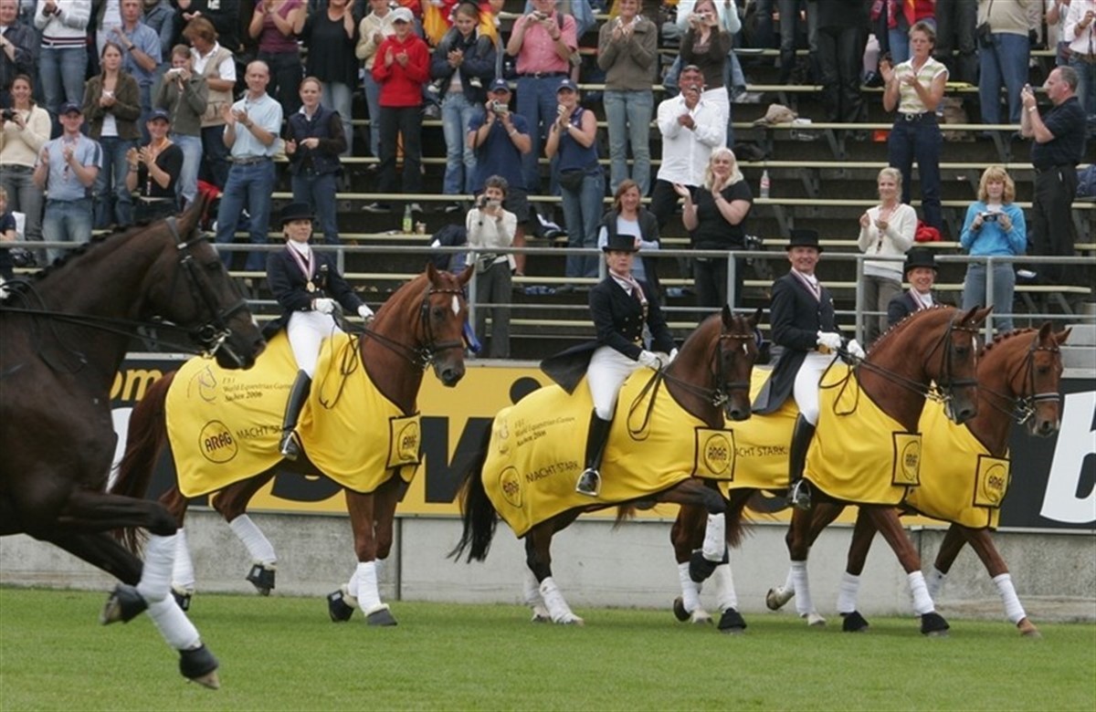 Foreningen af internationale dressurryttere har fremlagt FEI et forslag om at forøge sikkerheden under præmieoverrækkelse ved dressurstævner. Det foreslås, at kun de tre førstplacerede ryttere skal line op til selve præmieoverrækkelsen, hvor resten af de placerede ryttere (op til seks) kan skridte, trave eller galopere en omgang under speakerens præsentation af dem. Der bør altid være én til at håndtere hver enkelt hest ved paraden under selve præmieoverrækkelsen. En af de ting der fokuseres på er en begrænsning af lydniveauet af den ofte alt for høje musik, der spilles ved præmieoverrækkelser til dressurstævne. Dette er for at skærpe sikkerheden af ryttere såvel som heste. Under præmieoverrækkelsen ved WEG i Aachen sidste år demonstrerede Anky van Grunsvens hest Salinero, hvor hurtigt en meget farlig situation kan opstå. Hesten blev så skræmt, at den under æresrunden løb løbsk med sin gravide rytter, der måtte skrige om hjælp for at få udgangen åbnet, da hesten styrede direkte mod afspærringen og først blev standset på opvarmningsbanen.