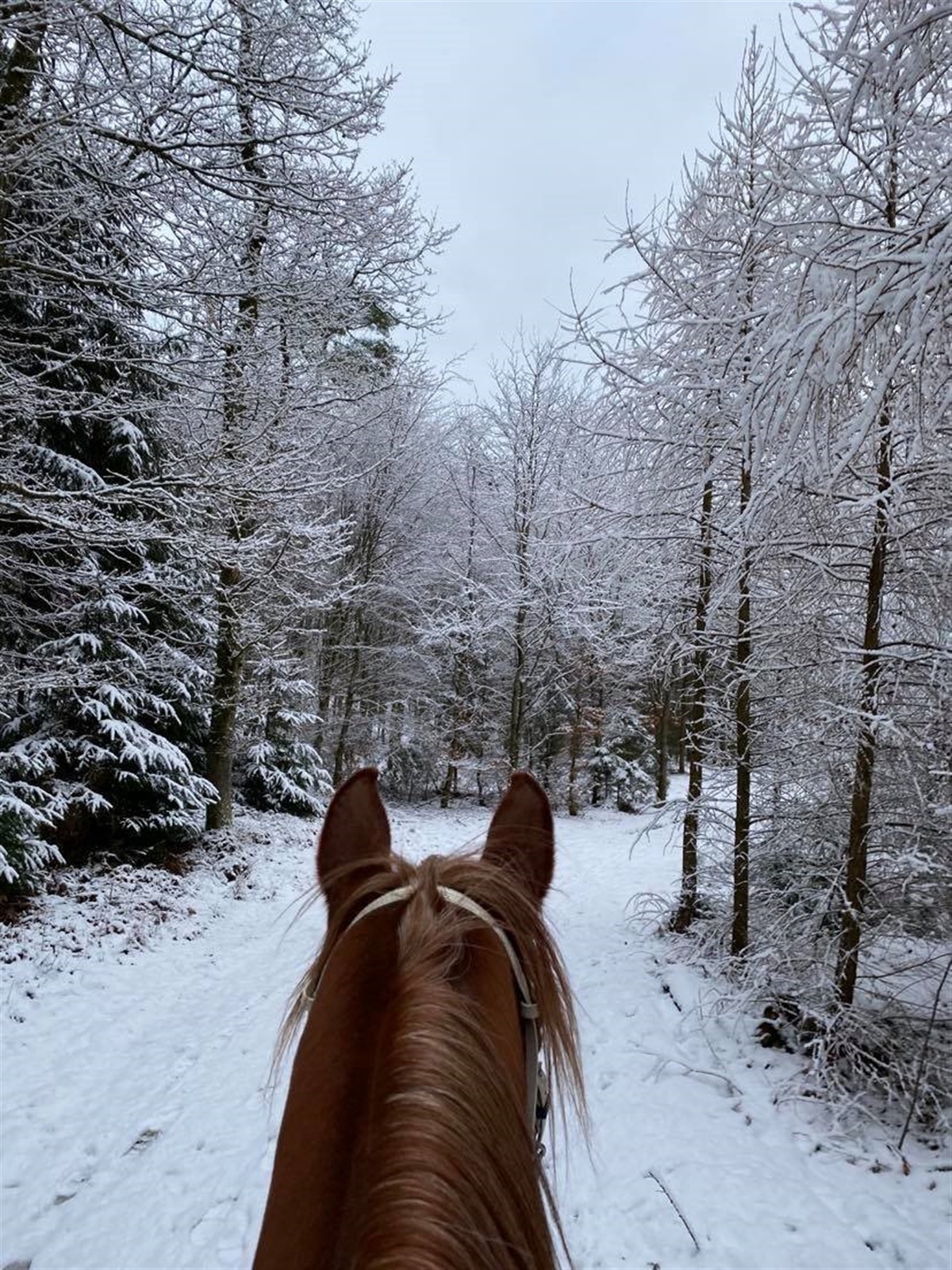 For mit vedkommende har mine heste haft en relativ rolig vinter. Selvom sidste års sæson ikke bestod af vildt mange stævner, så synes jeg alligevel det er rart at hestene kan have en periode over vinteren, hvor de bare får lov til at være foldbumser. Efter årsskiftet begyndte jeg stille og roligt igen. Det har været svært at vide hvor meget man skal træne, da der ikke har været nogen udsigt til stævner. Vi har derfor mest hygget os med en masse skridtture. Det har også været rart bare at kunne ride for sjov, uden at skulle følge en træningsplan. Der er noget helt specielt over at nyde de danske årstider fra hesteryggen. Om sommeren er det helt fantastisk bare at kunne ride afsted i T-shirt, og ikke skulle tænke over jakke, handsker, hue osv., inden man kan komme afsted, men der er nu også noget specielt over vinteren. Det er efterhånden nogle år siden vi har haft sådan rigtig vinter i Danmark, og det var virkelig smukt at opleve det igen. At ride igennem den nyfaldne sne, solen skinner, og sneen glimter fra træerne, det er altså ikke noget man oplever hver dag. Det var lidt ligesom at ride i et eventyr, selvom man er pakket ind i syv lag tøj, og stadig er ved at fryse sine tæer af!