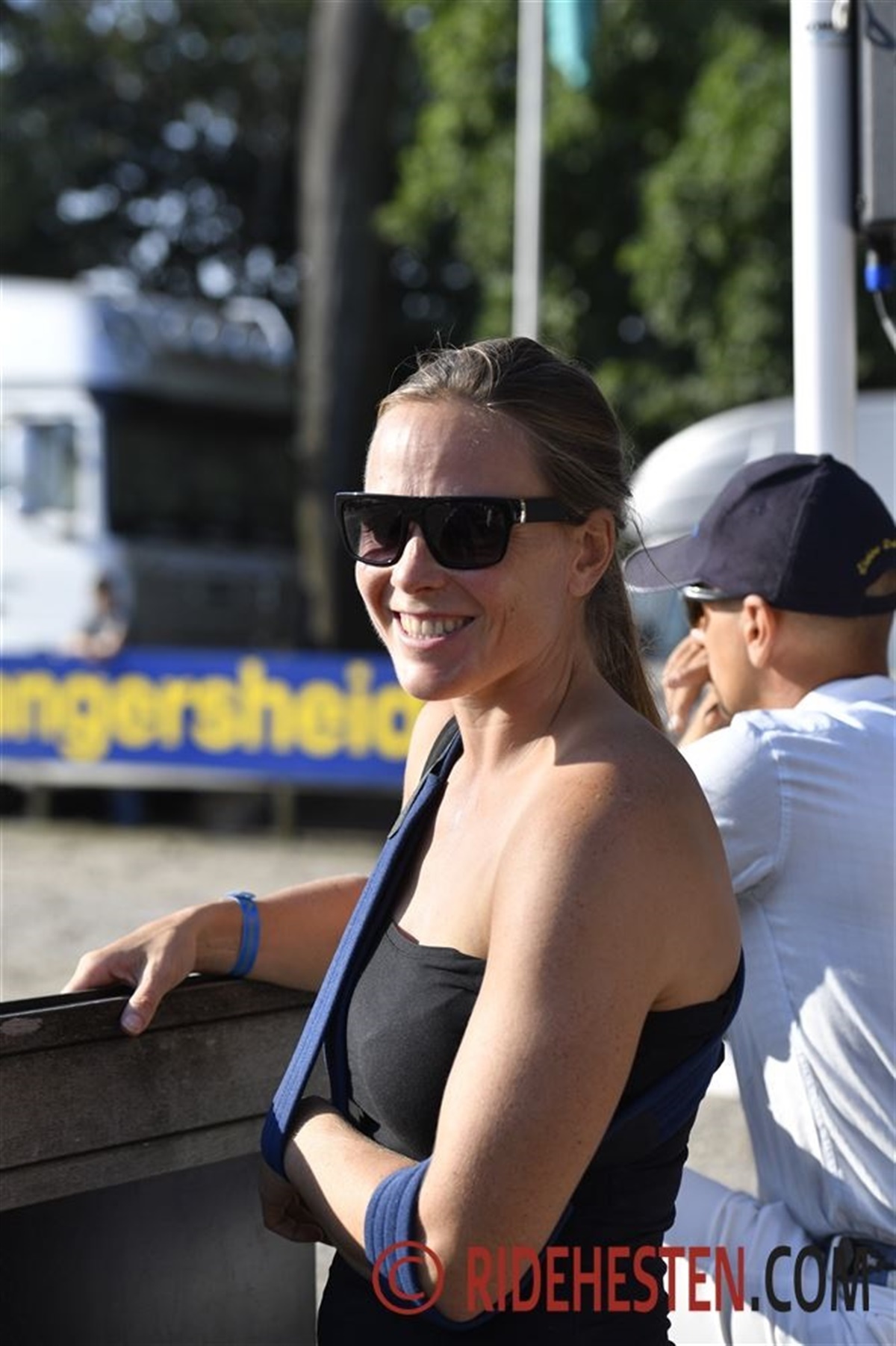 - Sidste mandag var jeg ved at trave Le Champ Ask varm, da han snubler, og jeg ryger ud over hovedet på ham. Det var omgående klart for Karen, at noget ikke var, som det skulle være. - Jeg sagde med det samme " jeg kommer ikke til at ride", fortæller hun. Et brækket kraveben blev det deprimernede resultat af det hændelige uheld. Og det ærgrer natruligvis Karen, som har haft UVM på Zangersheide som sit store mål i år. Hun kunne så se Søren ride Fendi Ask fejlfrit gennem banen med god luft til bommene. Søren har ikke nået at ride stævner på hoppen, men har blot redet hende nogle få gange hjemme på stutteriet, inden turen gik til Belgien i foregårs.