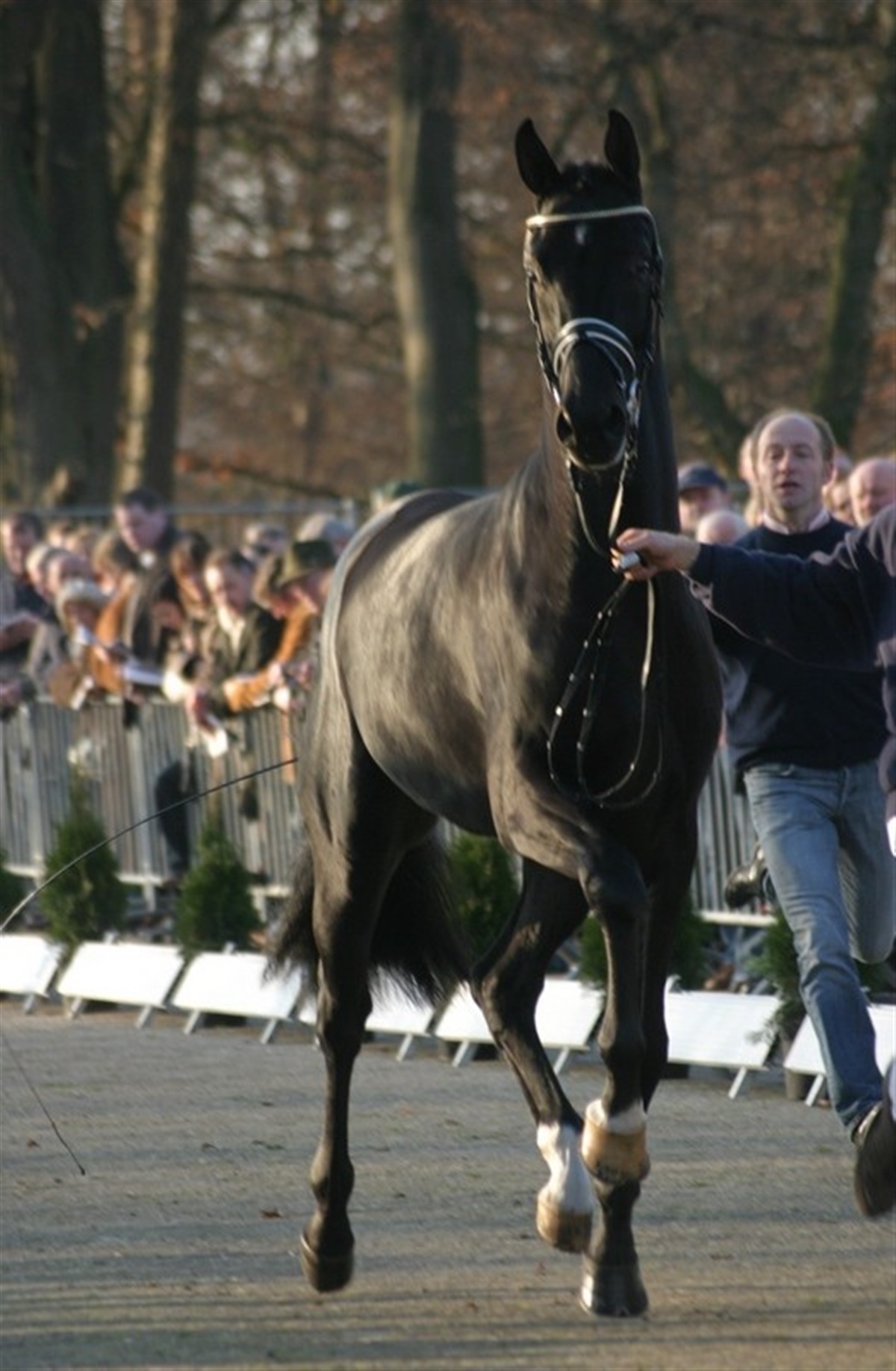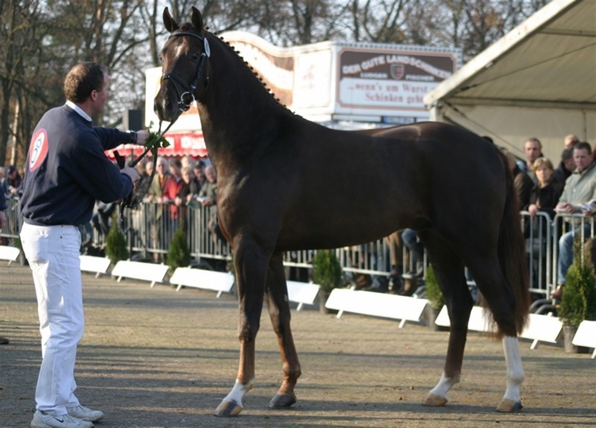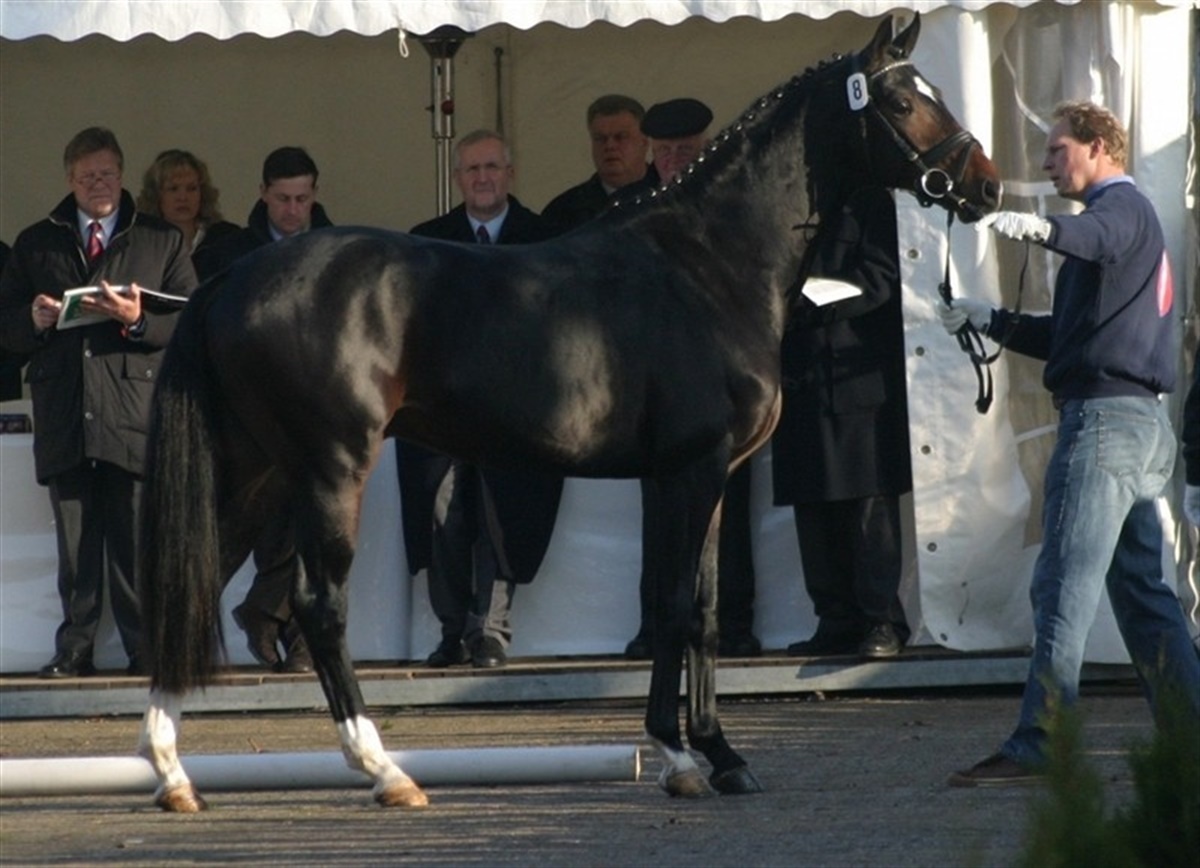 Frasorteringen er endnu ikke afsluttet i dagens etape af oldenburgerkåringen, men i holdet af dressurbetonede hingste er begge hingste fra danske Stutteri Blue Hors gået med videre til den endelige kåring imorgen lørdag. Indtil videre er 38 hingste kårede og vi mangler stadig at se hingstene i OS-forbundet, som er et datterforbund med rentrukne springheste. Stutteri Blue Hors, Randbøl, er repræsenteret af to nykårede hingste af særdeles god kvalitet. Kat. nr. 8 er indkøbt på følauktion og har udviklet sig til en moderne og særdeles velgående hingst, der er efter Dimaggio / Donnerhall og ud af en meget betydningsfuld hoppestamme, der også står bag den gangstærke Sandro Hit-søn kat. nr. 39. Blue Hors' kat. nr. 29 er født hjemme på stutteriet og er faldet efter hingsten Blue Hors Romanov og hoppen Fabina, der ikke blot er helsøster til Blue Hors Don Schufro men ligeledes var årets hoppe 2003 i oldenburgerforbundet. Også denne hingst har vist sig overordentligt godt med et kraftfuldt og opadgående bevægelsesforløb. Torsdag blev alle hingste vist udendørs på fast bund og herefter i ridehallen ligeledes i hånd. Fredag har alle hingste været løse for at vise galop og løsspringning. Imorgen tidlig er der longering efterfuldt af den endelige kåring og auktion. Selv om mange af de bedste hingste ikke er til salg, udbydes der alligevel en spændende kollektion på auktionen og der er mange danske interessenter ved kåringen, hvor snakken idag går ivrigt for sig. Hvem bliver årets fløjhingst? Bliver det en Florencio, en Sandro Hit eller bliver det én af de andre oplagte præmiehingste? Følg med imorgen her på siden.