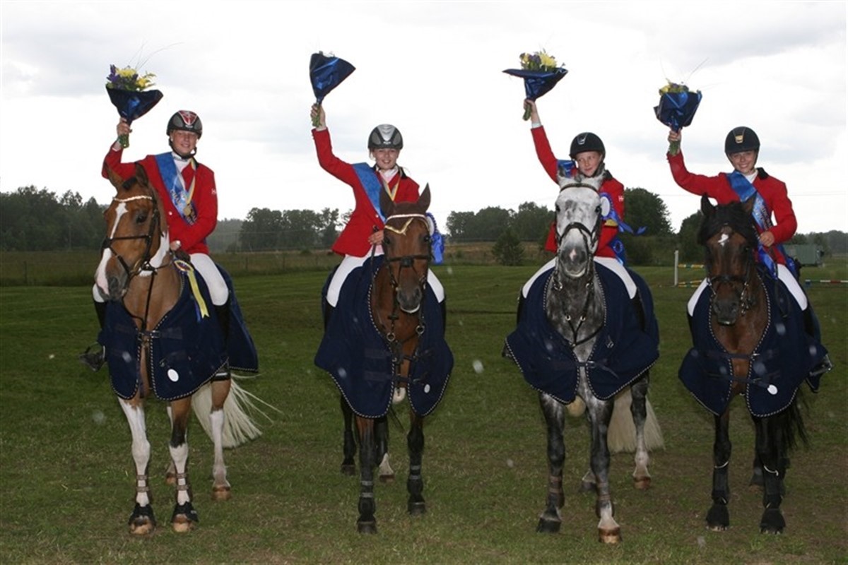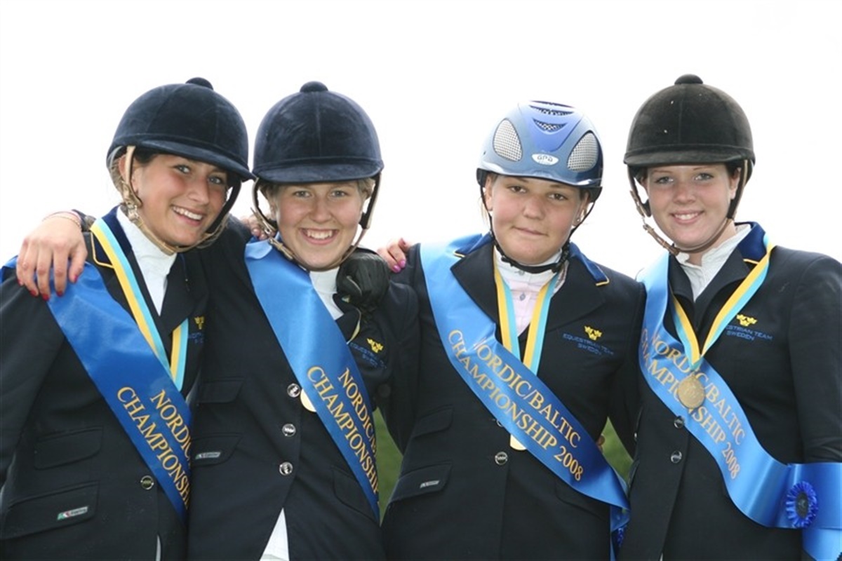 De unge danske ryttere førte flot Dannebrog frem på andendagen ved de Nordiske Mesterskaber i dressur og springning for pony, junior og ung ryttere i Sverige. På dressurbanen blev det i dag startede dagen godt. Holdet med kat. I ponyerne indkasserede en velfortjent førsteplads med 69,737% i gennemsnit og fik hermed guld. Bedste rytter i klassen blev danske Nanna Skodborg Merrald, 2. pladsen gik til Sofie Seeman og en 5. pladsen til Sofie Hougaard. Vores gruppe med kategori II ponyer scorede ligeledes guldmedaljer i deres hold konkurrence. Holdets samlede resultat blev 68,450%. Her var det Christina Møller og Casio som lå i spidesen af klassen med 69,298%. De tre øvrige danske placeringer blev en 2. plads til Cecilie Dafour, 4.pladsen til Jessica Vang Starbeck og 5.pladsen til Anne Tange. På springbanen blev de rød/hvide farver også vist frem. Her startede det med de Nordiske Holdmesterskaber for kat. II ponyer. Hvor det blev til en bronze medalje til det danske hold som sluttede med kun 4 fejl efter anden runde. De danske juniorryttere fik en flot 3.plads og bronzemedaljer i deres holdkonkurrence. Ved Holdmesterskaberne i ponyspringning kategori I blev det til noget af en gyser, hvor danskerne måtte ud i en omspringning mod de stærke konkurrenter: Svenskerne. Heldigvis kunne de danske ryttere holde nerverne i ro og de sluttede med 4 fejl i omspringningen. Hjemmeholdet sluttede med 8 fejl og måtte derfor nøjes med sølvet. Altså endnu en guldmedalje til et dansk hold og en velfortjent sejr.